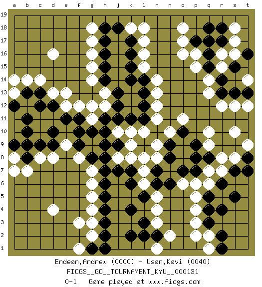 Last move : 0-1 2012 January 22 12:8:51 [Event "FICGS__GO__TOURNAMENT_KYU__000131"] [Site "FICGS"] [Date "2011.12.19"] [Round "1"] [Black "Endean,Andrew"] [White "Usan,Kavi"] [Result "0-1"] [Rating 1 "0000"] [Rating 2 "0040"] 1.r4 d16 2.q16 d4 3.d10 q10 4.k16 c14 5.k4 d8 6.c12 g17 7.c9 c8 8.b8 b7 9.b10 a8 10.b9 o17 11.p17 o16 12.r14 l17 13.k17 l16 14.k15 l15 15.k14 p4 16.q3 p3 17.r6 m4 18.h3 f3 19.l3 m3 20.m2 n2 21.k2 r8 22.s7 s8 23.t8 t9 24.t7 s10 25.l14 r7 26.s5 p16 27.q18 m14 28.l13 m13 29.l12 q13 30.r13 d13 31.c13 b14 32.b13 e13 33.d12 e12 34.e11 h13 35.j13 h12 36.h14 g14 37.h15 g15 38.h16 g16 39.h17 m12 40.j12 l10 41.k11 q6 42.q5 p5 43.q4 l6 44.h5 g4 45.h4 g5 46.h6 g6 47.h7 k10 48.h11 j8 49.h8 j10 50.j11 f8 51.f9 e9 52.f10 q14 53.q15 p15 54.h10 r12 55.s13 s12 56.t13 t12 57.h9 r15 58.s15 r16 59.q17 s16 60.n8 m9 61.q8 q7 62.k6 l7 63.k7 k8 64.j7 o18 65.l5 m5 66.g8 g7 67.j9 k9 68.l11 m11 69.n9 n10 70.p9 q9 71.p8 m1 72.l2 q2 73.r2 p2 74.r1 g2 75.h2 f12 76.f11 k18 77.j18 l18 78.o10 o11 79.o7 o6 80.n6 g18 81.h18 q1 82.d9 a13 83.a12 a14 84.b11 g3 85.g1 f1 86.h1 g11 87.g10 g12 88.p7 p6 89.m7 m8 90.m6 l8 91.a9 a7 92.t16 s17 93.r17 s18 94.r18 t14 0-1 Here are the names of the openings (joseki) played in the four corners : Corner q16 : q16 o17 Hoshi (Hwajeom, Seongjeom, Xingwei`) 4-4 Point. The star or hoshi (4-4) point, emphasizing influence at the potential expense of territory. Ikken Kakari (Hankan Keolch'im, Yi Gua`jiao~, 1-Space Low Approach). White 2 is the standard approach move to the 4-4. Corner q4 : r4 p4 Komoku (Somok, Xiao~mu`) 3-4 Point. The komoku (3-4) point is the traditional corner enclosure move.. Ikken Takagakari (Hankan Nop'dakeolch'im, Yi Gaogua`jiao~, 1-Space High Approach). The 5-4 approach move has become more popular in modern times, as modern Go emphasizes speed and influence. Player White won this Go (weiqi, baduk) game. Follow this game move after move (download)Don't disturb symmetry. (Anonymous) However beautiful the strategy, you should occasionally look at the results. (Winston Churchill)