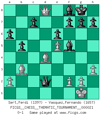 Last move : 0-1 2007 June 27 15:0:28 [Event "FICGS__CHESS__THEMATIC_TOURNAMENT__000021"] [Site "FICGS"] [Date "2007.01.10"] [Round "1"] [White "Sert,Ferdi"] [Black "Vasquez,Fernando"] [Result "0-1"] [WhiteElo "1397"] [BlackElo "1657"] 1.Nf3 d5 2.e4 dxe4 3.Ng5 Bf5 4.Nc3 Nf6 5.Bc4 e6 6.Qe2 Qd4 7.d3 exd3 8.cxd3 Nc6 9.Be3 Qd7 10.O-O Be7 11.h3 O-O 12.Nf3 Rad8 13.Rfd1 a6 14.d4 Nd5 15.Ne5 Nxe5 16.dxe5 Nxc3 17.bxc3 Qc6 18.Rac1 b5 19.Bb3 Ba3 20.Rxd8 Rxd8 21.Rd1 Rxd1+ 22.Qxd1 Qxc3 23.Qd8+ Bf8 24.Bd4 Qd2 0-1 Tennison (Lemberg, Zukertort) gambit Kingside Castling by player White (move 10) Kingside Castling by player Black (move 11) Player Black won this chess game. Follow this game move after move (download)Morphy was probably the greatest genius of them all. (Bobby Fischer) Gewöhnliche Menschen denken nur daran, wie sie ihre Zeit verbringen. Ein intelligenter Mensch versucht, sie auszunutzen. (Arthur Schopenhauer) Ayuda a tus piezas para que ellas te puedan ayudar. (Paul Morphy) La vérité est comme le meilleur coup aux échecs : elle existe, mais il faut la chercher. (Arturo Perez-Reverte) Pretend inferiority and encourage his arrogance. (Sun Tzu)
