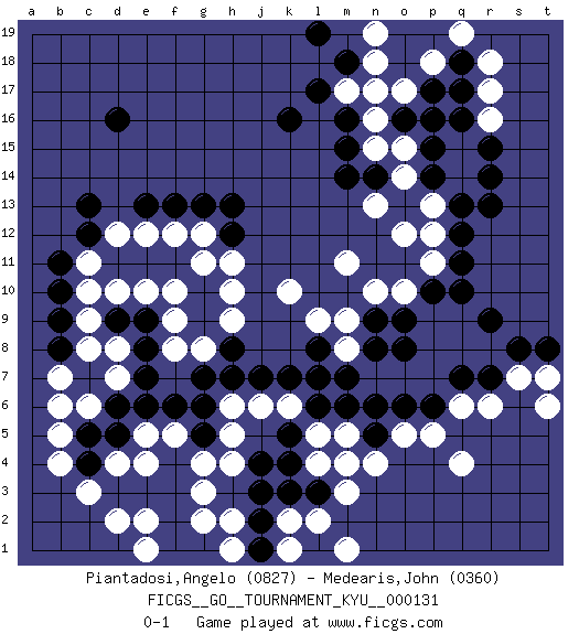 Last move : 0-1 2012 May 29 14:43:39 [Event "FICGS__GO__TOURNAMENT_KYU__000131"] [Site "FICGS"] [Date "2011.12.19"] [Round "1"] [Black "Piantadosi,Angelo"] [White "Medearis,John"] [Result "0-1"] [Rating 1 "0827"] [Rating 2 "0360"] 1.q16 q4 2.d16 d4 3.q10 d10 4.k4 k10 5.k16 n4 6.m6 n10 7.o8 l5 8.k5 k6 9.l6 m5 10.n6 m3 11.n5 l4 12.l3 m4 13.j3 o5 14.o6 p5 15.p6 q6 16.q7 r6 17.r7 s7 18.s8 t6 19.t8 t7 20.r9 p11 21.p10 o10 22.o9 o12 23.q11 p12 24.q12 q14 25.r13 l2 26.k3 k2 27.j2 k1 28.j1 m1 29.c13 e12 30.g13 g12 31.f13 f12 32.e13 d12 33.c12 c11 34.b11 c10 35.b10 c8 36.b9 d8 37.h12 h11 38.h13 m8 39.k7 j6 40.j7 h6 41.h7 g4 42.g6 h5 43.g5 h4 44.f4 g3 45.f3 e2 46.f2 g2 47.f1 h1 48.g1 h2 49.j4 f5 50.f6 e5 51.e3 d2 52.d3 c3 53.e6 e4 54.d5 e1 55.c5 b5 56.e7 c6 57.d6 b6 58.b8 b7 59.e8 d7 60.l7 f9 61.g9 g8 62.g7 h9 63.g10 h10 64.h8 f8 65.l8 l9 66.n9 m9 67.n8 m11 68.o13 n13 69.p14 p13 70.n14 o14 71.p15 n15 72.m14 o15 73.m15 m17 74.o16 q15 75.p16 n16 76.m16 n18 77.l17 o17 78.q13 f10 79.m7 g11 80.e9 e10 81.d9 c9 82.c4 b4 83.r15 r18 84.p17 p18 85.q18 q19 86.q17 r17 87.r14 r16 88.m18 n17 89.l19 n19 0-1 This go game has been lost on time (started : 2011.12.19 14:37:39) Here are the names of the openings (joseki) played in the four corners : Corner d4 : d4 j3 Hoshi (Hwajeom, Seongjeom, Xingwei`) 4-4 Point. The star or hoshi (4-4) point, emphasizing influence at the potential expense of territory. Corner q16 : q16 p11 Hoshi (Hwajeom, Seongjeom, Xingwei`) 4-4 Point. The star or hoshi (4-4) point, emphasizing influence at the potential expense of territory. Player White won this Go (weiqi, baduk) game. Follow this game move after move (download)Pon-nuki is worth thirty points. (Anonymous) Hardware: the parts of a computer that can be kicked. (Jeff Persis)