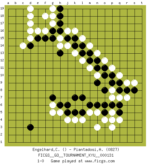 Last move : 1-0 2012 April 24 1:40:30 [Event "FICGS__GO__TOURNAMENT_KYU__000131"] [Site "FICGS"] [Date "2011.12.19"] [Round "1"] [Black "Engelhard,Christof"] [White "Piantadosi,Angelo"] [Result "1-0"] [Rating 2 "0827"] 1.d3 q4 2.p4 p3 3.o5 p5 4.q5 o4 5.p6 p4 6.q6 n5 7.o6 n3 8.n6 m5 9.m6 l6 10.l5 l4 11.k5 g5 12.h6 h5 13.j6 g6 14.l7 k6 15.k7 k4 16.j5 j4 17.g7 d16 18.e15 d15 19.d14 e16 20.f15 f16 21.g15 k16 22.g16 g17 23.h17 g18 24.h18 j16 25.f17 f18 26.e17 d17 27.e18 d18 28.e19 d19 29.h16 h15 30.j15 h14 31.f19 g19 32.h19 c14 33.h13 j14 34.k15 l15 35.k14 k13 36.l14 m14 37.l13 l12 38.m13 n13 39.m12 m11 40.n12 o12 41.n11 n10 42.o11 p11 43.o10 o9 44.p10 q10 45.p9 p8 46.q9 r9 47.q8 q7 48.r8 r7 49.s8 s9 50.o8 p7 51.n9 1-0 Here are the names of the openings (joseki) played in the four corners : Corner q4 : q4 p4 Hoshi (Hwajeom, Seongjeom, Xingwei`) 4-4 Point. The star or hoshi (4-4) point, emphasizing influence at the potential expense of territory. Corner d4 : d3 g5 Komoku (Somok, Xiao~mu`) 3-4 Point. The komoku (3-4) point is the traditional corner enclosure move.. Corner d16 : d16 e15 Hoshi (Hwajeom, Seongjeom, Xingwei`) 4-4 Point. The star or hoshi (4-4) point, emphasizing influence at the potential expense of territory. Corner q16 : l15 l14 This joseki is unknown. A weak or weird move has probably been played in this corner. Player Black won this Go (weiqi, baduk) game. Follow this game move after move (download)The carpenter's square becomes ko. (Anonymous) Follow your passion, and success will follow you. (Arthur Buddhold)