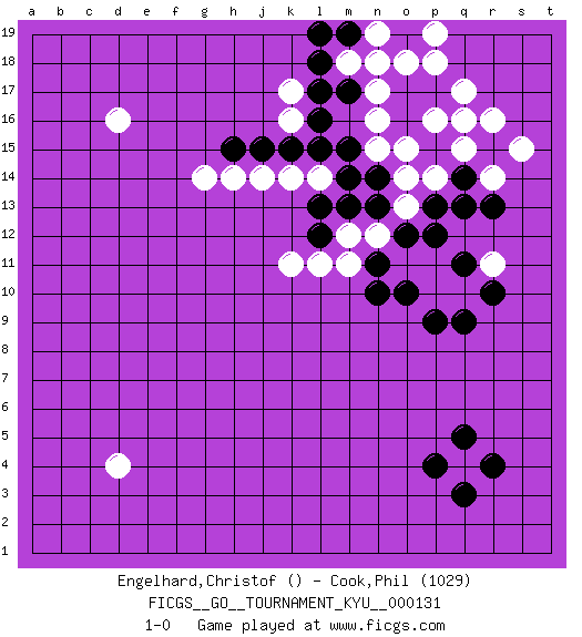 Last move : 1-0 2012 February 29 21:15:4 [Event "FICGS__GO__TOURNAMENT_KYU__000131"] [Site "FICGS"] [Date "2011.12.19"] [Round "1"] [Black "Engelhard,Christof"] [White "Cook,Phil"] [Result "1-0"] [Rating 2 "1029"] 1.r4 r16 2.q16 q4 3.q5 q15 4.p15 p16 5.r15 q17 6.p4 d16 7.q3 r14 8.p17 s15 9.o16 q16 10.q14 p14 11.q13 o15 12.o17 n15 13.p13 o13 14.o12 n16 15.n13 o14 16.n14 n17 17.o19 n19 18.n18 m18 19.m19 p18 20.m15 o18 21.l19 n19 22.l18 p19 23.l17 d4 24.r13 k16 25.l16 l14 26.l15 m12 27.m14 n12 28.l13 k14 29.l12 o11 30.p12 k17 31.k15 j14 32.n11 m11 33.n10 l11 34.m17 n18 35.j15 h14 36.m13 k11 37.h15 g14 38.o10 p11 39.q11 p10 40.p9 q10 41.r10 r11 42.q9 1-0 Here are the names of the openings (joseki) played in the four corners : Corner q16 : r16 q16 Komoku (Somok, Xiao~mu`) 3-4 Point. The komoku (3-4) point is the traditional corner enclosure move.. Corner q4 : r4 q4 Komoku (Somok, Xiao~mu`) 3-4 Point. The komoku (3-4) point is the traditional corner enclosure move.. Player Black won this Go (weiqi, baduk) game. Follow this game move after move (download)The L-group is dead. (Anonymous) Experience is the name we all give to our mistakes. (Oscar Wilde)