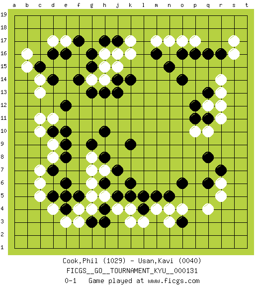 Last move : 0-1 2012 February 29 21:15:38 [Event "FICGS__GO__TOURNAMENT_KYU__000131 "] [Site "FICGS"] [Date "2011.12.19"] [Round "1"] [Black "Cook,Phil "] [White "Usan,Kavi "] [Result "0-1"] [Rating 1 "1029"] [Rating 2 "0040"] 1.d16 q4 2.q16 d4 3.k9 k16 4.d10 k4 5.q8 r14 6.o3 r6 7.q6 r5 8.d7 c14 9.g16 b16 10.k14 j15 11.j13 o17 12.o14 r11 13.r7 o4 14.o6 n3 15.k6 c6 16.e6 c7 17.d14 c13 18.e12 g6 19.f5 j6 20.j7 h7 21.j5 h5 22.h6 g5 23.h10 g8 24.h8 g7 25.g9 d8 26.e8 d9 27.e9 c10 28.h4 g4 29.h3 f4 30.e4 e3 31.e5 j4 32.g3 f3 33.m5 m4 34.n5 n4 35.m16 m17 36.o16 p17 37.p16 n17 38.n15 s16 39.r16 s17 40.q13 r13 41.q11 h14 42.h13 g14 43.g13 d11 44.e10 c11 45.d5 c5 46.c15 b15 47.j17 k17 48.j14 h16 49.h17 j16 50.f14 d17 51.e16 e17 52.f17 q12 53.p12 r12 54.k5 q10 55.p11 p10 56.l4 l3 57.l5 k3 58.g15 h15 0-1 Here are the names of the openings (joseki) played in the four corners : Corner q4 : q4 q8Hoshi (Hwajeom, Seongjeom, Xingwei`) 4-4 Point. The star or hoshi (4-4) point, emphasizing influence at the potential expense of territory. Corner q16 : q16 r14Hoshi (Hwajeom, Seongjeom, Xingwei`) 4-4 Point. The star or hoshi (4-4) point, emphasizing influence at the potential expense of territory.Ikken Kakari (Hankan Keolch'im, Yi Gua`jiao~, 1-Space Low Approach). White 2 is the standard approach move to the 4-4. Corner d4 : d4 d7Hoshi (Hwajeom, Seongjeom, Xingwei`) 4-4 Point. The star or hoshi (4-4) point, emphasizing influence at the potential expense of territory.Niken Takagakari (Dukan Nop'dakeolch'im, E`r Gaojia, 2-Space High Approach). Black 2 is a light approach move. Rarely played in even games, Black 2 is typically employed in handicap games. White continues with 6-4 or 3-10. In Korean Sunjang Baduk White has a stone on 8-4. Corner d16 : d16 c14Hoshi (Hwajeom, Seongjeom, Xingwei`) 4-4 Point. The star or hoshi (4-4) point, emphasizing influence at the potential expense of territory.Ikken Kakari (Hankan Keolch'im, Yi Gua`jiao~, 1-Space Low Approach). White 2 is the standard approach move to the 4-4. Player White won this Go (weiqi, baduk) game.Follow this game move after move (download ) With only one group, you will win. (Anonymous) 'preceded by its own quotation yields a falsehood' preceded by its own quotation yields a falsehood. (W. V. O. Quine - Set Theory And Its Logic, 1953)