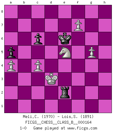 Last move : 1-0 2012 January 7 11:42:44 [Event "FICGS__CHESS__CLASS_B__000164"] [Site "FICGS"] [Date "2011.12.20"] [Round "1"] [White "Meli,Cosimo Leonardo"] [Black "Lois,Spyros"] [Result "1-0"] [WhiteElo "1970"] [BlackElo "1891"] 1.e4 e5 2.Nf3 Nc6 3.d4 exd4 4.Nxd4 Nf6 5.Nxc6 dxc6 6.Qxd8+ Kxd8 7.f3 Be6 8.Nd2 a5 9.a4 Nd7 10.Bc4 Ke7 11.Kf2 g6 12.Bxe6 Kxe6 13.Nb3 Bg7 14.c3 c5 15.Bf4 Be5 16.Bxe5 Kxe5 17.Rhd1 Ke6 18.Rd5 b6 19.Rad1 Nf6 20.R5d2 Ne8 21.Nc1 g5 22.Rd7 Rc8 23.R7d5 f6 24.h4 h6 25.Ne2 Nd6 26.Ng3 Rce8 27.b3 gxh4 28.Ne2 Kd7 29.c4 Re5 30.Nf4 Rhe8 31.Ng6 Rxd5 32.Rxd5 h3 33.g4 c6 34.Rh5 Nf7 35.Rxh3 b5 36.Rh5 Rg8 37.Nf4 bxc4 38.bxc4 Rg5 39.Rh4 Kd6 40.Ke3 Ke7 41.Ke2 Rg8 42.Nd3 Kd6 43.f4 Re8 44.Kf3 Rd8 45.Rh5 Ke7 46.Ke3 Nd6 47.Rxc5 Kd7 48.e5 Nb7 49.exf6 Nxc5 50.Nxc5+ Ke8 51.Ke4 Rd1 52.g5 Kf7 53.Nd3 hxg5 54.fxg5 Rd2 55.Ne5+ Ke6 56.f7 Re2+ 57.Kd3 1-0 Scotch : Schmidt variation 10 pieces endgame at move 54 : White KNPPPP , Black KRPP WHITE : King + 1 Knight 4 Pawns BLACK : King + 1 Rook 2 Pawns Player White won this chess game. Follow this game move after move (download)Nowadays, when you're not a grandmaster at 14, you can forget about it. (Anand Viswanathan) Nie in meinem Leben habe ich die französische Verteidigung gespielt, welche die Stumpfsinnigste von allen ist. (Wilhelm Steinitz) Cualquier cambio de material en una posición debe venir por medio de un mate, una captura o promoción de Peón. (Purdy) Celui qui prend des risques peut perdre, celui qui n'en prend pas perd toujours. (Xavier Tartacover) Have no fear of perfection - you'll never reach it. (Salvador Dali)