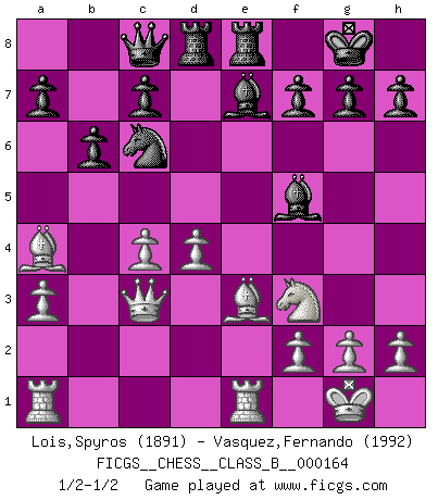 Last move : 1/2-1/2 2012 October 17 5:14:48 [Event "FICGS__CHESS__CLASS_B__000164"] [Site "FICGS"] [Date "2011.12.20"] [Round "1"] [White "Lois,Spyros"] [Black "Vasquez,Fernando"] [Result "1/2-1/2"] [WhiteElo "1891"] [BlackElo "1992"] 1.e4 e5 2.Nf3 Nf6 3.Nxe5 d6 4.Nf3 Nxe4 5.d4 d5 6.Bd3 Nc6 7.O-O Be7 8.c4 Nb4 9.Be2 O-O 10.Nc3 Bf5 11.a3 Nxc3 12.bxc3 Nc6 13.Re1 Re8 14.cxd5 Qxd5 15.Bf4 Bd6 16.c4 Qe4 17.Be3 Rad8 18.Ra2 Qe7 19.Qa1 Qd7 20.Qc3 b6 21.Bd1 Qc8 22.Ba4 Bd7 23.Bc2 Bf5 24.R2a1 Be7 25.Ba4 Bd7 26.Bc2 Bf5 27.Ba4 1/2-1/2 Comment by player 1 : Spyros Lois : Hi, i use a Pentium D 2.8 Ghz Petrov : Classical attack Kingside Castling by player White (move 7) Kingside Castling by player Black (move 9) This chess game ended in a draw. Follow this game move after move (download)It is the aim of the modern school, not to treat every position according to one general law, but according to the principle inherent in the position. (Richard Reti) Alles was ich jemals tun will ist Schach spielen. (Robert James Fischer) No es tiempo de jugar al Ajedrez cuando la casa esta en llamas. (Proverbio Italiano) Le système Elo représente seulement une moyenne. Il est simplement un indicateur de votre stabilité. (Anatoli Karpov) If everyone is thinking alike, then somebody isn't thinking. (US General George S. Patton)