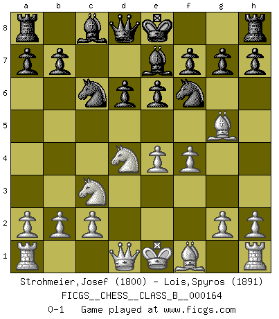 Last move : 0-1 2012 February 5 17:57:51 [Event "FICGS__CHESS__CLASS_B__000164"] [Site "FICGS"] [Date "2011.12.20"] [Round "1"] [White "Strohmeier,Josef"] [Black "Lois,Spyros"] [Result "0-1"] [WhiteElo "1800"] [BlackElo "1891"] 1.e4 c5 2.Nf3 Nc6 3.d4 cxd4 4.Nxd4 Nf6 5.Nc3 d6 6.Bg5 e6 7.f4 Be7 0-1 Sicilian defense Player Black won this chess game. Follow this game move after move (download)One bad move nullifies forty good ones. (Horowitz) Es genügt nicht ein guter Spieler zu sein, man muß auch gut spielen. (Siegbert Tarrasch) Una mala movida nulifica cuarenta buenas. (Horowitz) Les échecs, c'est l'imagination. (David Bronstein) Vladimir Ras-Putin is still alive... He is also a good actor, I saw him in the Lord of the Rings. (Rodolfo d'Ettorre)