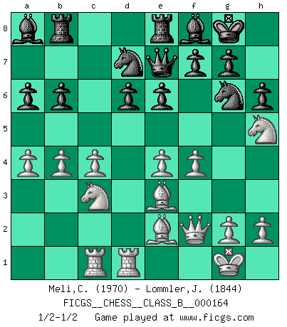 Last move : 1/2-1/2 2012 February 7 12:43:25 [Event "FICGS__CHESS__CLASS_B__000164"] [Site "FICGS"] [Date "2011.12.20"] [Round "1"] [White "Meli,Cosimo Leonardo"] [Black "Lommler,Jan Peter"] [Result "1/2-1/2"] [WhiteElo "1970"] [BlackElo "1844"] 1.e4 c5 2.Nf3 d6 3.d4 cxd4 4.Nxd4 Nf6 5.f3 a6 6.c4 e6 7.Be3 Be7 8.Be2 O-O 9.O-O Nbd7 10.Nc3 Qc7 11.Qe1 b6 12.Qg3 Re8 13.a4 Ne5 14.Rfc1 Ng6 15.b4 Nd7 16.f4 Bf6 17.Qf2 Rb8 18.Rd1 Bb7 19.Rac1 Rbd8 20.Bh5 Re7 21.Qd2 Ba8 22.Nde2 R7e8 23.Ng3 Bh4 24.Bf2 Nf6 25.Bf3 h6 26.Be3 Nd7 27.Qe2 Be7 28.Qf2 Rb8 29.Nh5 Qd8 30.Bg4 Bf8 31.Be2 Qe7 32.Rd2 Rbc8 33.R2d1 Rb8 34.Rd2 Rbc8 35.R2d1 Rb8 1/2-1/2 Sicilian : Prins (Moscow) variation Kingside Castling by player Black (move 8) Kingside Castling by player White (move 9) This chess game ended in a draw. Follow this game move after move (download)Adequate compensation for a sacrifice is having a sound combination leading to a winning position; adequate compensation for a blunder is having your opponent snatch defeat from the jaws of victory. (Bruce A. Moon) Kasparov stellt für gewöhnlich die Regeln auf und bricht sie dann selbst wieder. (Alexej Shirov) Después de la respuesta de las negras a 1.e4 con 1..e5, se quedan siempre tratando de entrar dentro del juego. (Howard Staunton) Vous n'êtes pas toujours obligé de jouer le meilleur coup. Un coup doit être actif, entreprenant, correct et beau ! (David Bronstein) If you know the enemy and know yourself you need not fear the results of a hundred battles. (Sun Tzu)
