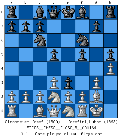 Last move : 0-1 2012 February 5 17:58:1 [Event "FICGS__CHESS__CLASS_B__000164"] [Site "FICGS"] [Date "2011.12.20"] [Round "1"] [White "Strohmeier,Josef"] [Black "Jozefini,Lubor"] [Result "0-1"] [WhiteElo "1800"] [BlackElo "1863"] 1.Nf3 f5 2.d3 Nc6 3.g3 d5 4.Bg2 e5 5.O-O Nf6 6.Nbd2 e4 7.Ne1 h5 8.h4 e3 0-1 Reti v Dutch Kingside Castling by player White (move 5) Player Black won this chess game. Follow this game move after move (download)A good player is always lucky. (Jose Raul Capablanca) Wenn Du absolut nicht mehr weißt, was Du tun sollst, dann ist es Zeit für Panik. (John van der Wiel) La pasion por jugar al Ajedrez es una de las mas inexplicables en el mundo. (H.G. Wells) Assurément je connaissais par expérience le mystérieux attrait de ce jeu royal, le seul entre tous les jeux inventés par les hommes qui échappe souverainement à la tyrannie du hasard, le seul où l'on ne doive sa victoire qu'à son intelligence ou plutôt à une certaine forme d'intelligence. Mais n'est-ce pas déjà le limiter injurieusement que d'appeler les échecs un jeu ? N'est-ce pas une science, un art ou quelque chose qui, comme le cercueil de Mahomet entre ciel et terre, est suspendu entre l'un et l'autre, et qui réunit un nombre incroyable de contraires ? [...] C'est une pensée qui ne mène à rien, une mathématique qui n'établit rien, un art qui ne laisse pas d'uvre, une architecture sans matière; et il l'a prouvé néanmoins qu'il était plus durable, à sa manière, que les livres ou que tout autre monument, ce jeu unique qui appartient à tous les peuples et à tous les temps, et dont personne ne sait quel dieu en fit don à la terre pour tuer l'ennui, pour aiguiser l'esprit et stimuler l'âme. Où commence-t-il, où finit-il ? (Stefan Zweig) Internet: Absolute communication, absolute isolation. (Paul Carvel)