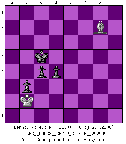 Last move : 0-1 2012 May 9 8:45:28 [Event "FICGS__CHESS__RAPID_SILVER__000080"] [Site "FICGS"] [Date "2011.12.20"] [Round "1"] [White "Bernal Varela,Nelson"] [Black "Gray,Garvin"] [Result "0-1"] [WhiteElo "2130"] [BlackElo "2200"] 1.e4 e5 2.Nf3 Nc6 3.Bb5 a6 4.Ba4 Nf6 5.O-O Be7 6.Nc3 b5 7.Bb3 d6 8.Nd5 Na5 9.Nxe7 Qxe7 10.d3 h6 11.Bd2 Nxb3 12.axb3 O-O 13.b4 Nh7 14.Qe2 Bb7 15.Bc1 f5 16.Nd2 fxe4 17.Nxe4 Nf6 18.Bd2 Qe6 19.f3 Nd5 20.b3 Rab8 21.Rfb1 Qg6 22.Kh1 Ne7 23.Be3 Nc6 24.Qd2 Nd4 25.Qf2 Ne6 26.Re1 Rf7 27.Qd2 d5 28.Nc5 d4 29.Bf2 Nxc5 30.bxc5 Rxf3 31.Bg3 Qc6 32.Re2 Rf5 33.b4 Rbf8 34.Kg1 a5 35.bxa5 Qxc5 36.h4 R8f6 37.Rae1 Re6 38.Kh2 Qd5 39.Rb1 Kh7 40.Rf2 Rxf2 41.Qxf2 e4 42.dxe4 Rxe4 43.Qf3 Qe6 44.Qd3 Qg6 45.Re1 Rxe1 46.Qxg6+ Kxg6 47.Bxe1 c5 48.Kg3 b4 49.Kf4 Kf6 50.h5 Ke6 51.g4 Kd5 52.Kf3 Kc4 53.Ke2 Bc8 54.Kd2 Kb5 55.Bg3 Kxa5 56.Bd6 Kb5 57.g5 Bg4 58.gxh6 gxh6 59.Bf8 Bxh5 60.Kc1 Bg6 61.Bxh6 Bxc2 62.Kxc2 c4 63.Bg7 b3+ 64.Kb2 Kc5 0-1 Ruy Lopez : Closed defense Kingside Castling by player White (move 5) Kingside Castling by player Black (move 12) 10 pieces endgame at move 58 : White KBPP , Black KBPPPP WHITE : King + 1 Bishop 2 Pawns BLACK : King + 1 Bishop 4 Pawns 9 pieces endgame at move 59 : White KBP , Black KBPPPP WHITE : King + 1 Bishop 1 Pawn BLACK : King + 1 Bishop 4 Pawns 8 pieces endgame at move 61 : White KBP , Black KBPPP WHITE : King + 1 Bishop 1 Pawn BLACK : King + 1 Bishop 3 Pawns 7 pieces endgame at move 61 : White KB , Black KBPPP WHITE : King + 1 Bishop BLACK : King + 1 Bishop 3 Pawns 6 pieces endgame at move 62 : White KB , Black KPPP WHITE : King + 1 Bishop BLACK : King + 3 Pawns Player Black won this chess game. Follow this game move after move (download)There is only one thing Fischer does in Chess without pleasure: to lose ! (Boris Spassky) Jeder weiß, dass Gasprom Putins persönliches Machtinstrument ist. Die Firma wird vom Kreml aus geleitet und wird schon deshalb nie transparent sein. (Garry Kasparov) Alguna parte de un error es siempre correcto. (Savielly Tartakover) Lorsque vous vous retrouvez devant une position atroce, ne tendez pas un ultime piège dérisoire avec l'intention d'abandonner si l'adversaire le déjoue ! Faites-vous plutôt un devoir de résister comme si votre vie en dépendait. Jouez le coup qui vous déplairait au centuple si vous étiez dans la peau de votre tortionnaire ! Remember : Your focus determines your reality. (Qui-Gon Jinn in Star Wars ep.1)