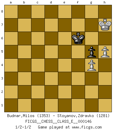 Last move : 1/2-1/2 2012 February 6 11:45:25 [Event "FICGS__CHESS__CLASS_E__000146"] [Site "FICGS"] [Date "2011.12.20"] [Round "1"] [White "Budnar,Milos"] [Black "Stoyanov,Zdravko"] [Result "1/2-1/2"] [WhiteElo "1353"] [BlackElo "1281"] 1.e4 c5 2.d4 cxd4 3.c3 dxc3 4.Nxc3 a6 5.Nf3 d6 6.Be2 h6 7.O-O Nc6 8.h3 e5 9.a3 Nf6 10.Qa4 Bd7 11.Qb3 Na5 12.Qd1 Nc6 13.b4 Be7 14.Bb2 O-O 15.Qd3 Be6 16.Nd5 Nd7 17.Nxe7 Qxe7 18.Rfd1 Nf6 19.Qxd6 Qxd6 20.Rxd6 Nxe4 21.Rd3 Bc4 22.Re3 Bxe2 23.Rxe2 Nd6 24.Bxe5 Rfe8 25.Rae1 Nc4 26.Bc3 Rxe2 27.Rxe2 a5 28.b5 Na7 29.a4 Nb6 30.Ra2 Nd5 31.Bxa5 b6 32.Rd2 bxa5 33.Rxd5 Rb8 34.Nd4 Kh7 35.Nc6 Nxc6 36.bxc6 Rc8 37.Rc5 Kg6 38.g4 Rc7 39.Kg2 Kf6 40.h4 g5 41.h5 Ke6 42.Kg3 Kd6 43.Rxa5 Rxc6 44.Rf5 Ke6 45.a5 f6 46.f3 Kd7 47.Rb5 Ra6 48.Rb6 Rxb6 49.axb6 Kc6 50.f4 Kxb6 51.fxg5 fxg5 52.Kf3 Kc6 53.Ke4 Kd6 54.Kf5 Kd5 55.Kg6 Ke6 56.Kxh6 Kf6 57.Kh7 Kf7 58.Kh8 Kf6 59.Kh7 Kf7 60.Kh6 Kf6 61.Kh7 1/2-1/2 Sicilian : Smith-Morra gambit Kingside Castling by player White (move 7) Kingside Castling by player Black (move 14) 10 pieces endgame at move 48 : White KPPPP , Black KRPPP WHITE : King + 4 Pawns BLACK : King + 1 Rook 3 Pawns 9 pieces endgame at move 49 : White KPPPP , Black KPPP WHITE : King + 4 Pawns BLACK : King + 3 Pawns 8 pieces endgame at move 50 : White KPPP , Black KPPP WHITE : King + 3 Pawns BLACK : King + 3 Pawns 7 pieces endgame at move 51 : White KPPP , Black KPP WHITE : King + 3 Pawns BLACK : King + 2 Pawns 6 pieces endgame at move 51 : White KPP , Black KPP WHITE : King + 2 Pawns BLACK : King + 2 Pawns 5 pieces endgame at move 56 : White KPP , Black KP WHITE : King + 2 Pawns BLACK : King + 1 Pawn This chess game ended in a draw. Follow this game move after move (download)The hallmark of the artist is simplicity. (Larry Evans) Sie bekommen vielleicht den Eindruck, dass die Spitzenspieler überhaupt gar nicht so stark sind. Aber das stimmt nicht. Es ist eine Illusion. Mit einem Computer an der Seite ist es sehr leicht, Urteile zu fällen, aber wenn man alleine am Brett sitzt, sieht die Sache ganz anders aus. (Vladimir Kramnik) Bobby Fischer es el jugador de Ajedrez mas grande que jamás haya existido. (Ken Smith) Les échecs sont plus proches de l'art de l'assassinat que de l'art de la guerre. (Arturo Perez-Reverte) Programming can only do so much before it becomes too much. (Don Groves)