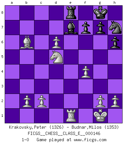 Last move : 1-0 2012 March 5 10:4:52 [Event "FICGS__CHESS__CLASS_E__000146"] [Site "FICGS"] [Date "2011.12.20"] [Round "1"] [White "Krakovsky,Peter"] [Black "Budnar,Milos"] [Result "1-0"] [WhiteElo "1326"] [BlackElo "1353"] 1.e4 e5 2.Nf3 Nc6 3.Bb5 a6 4.Ba4 Nf6 5.O-O Be7 6.Re1 b5 7.Bb3 h6 8.a4 Bb7 9.d4 Nxd4 10.Nxd4 exd4 11.e5 Nh7 12.Qxd4 O-O 13.axb5 c5 14.bxc6 Bxc6 15.Be3 Bg5 16.f4 Be7 17.Nc3 a5 18.Nd5 a4 19.Bxa4 Bxa4 20.Rxa4 Rxa4 21.Qxa4 d6 22.Bb6 Qe8 23.Qxe8 Rxe8 24.exd6 1-0 Ruy Lopez : Closed Kingside Castling by player White (move 5) Kingside Castling by player Black (move 12) Player White won this chess game. Follow this game move after move (download)All my games are real. (Bobby Fischer) Die Leute spielen gegen mich seit 15 Jahren unter Ihren Möglichkeiten. (Robert James Fischer) El Ajedrez es de 30 a 40 por ciento psicología. Uno no cuenta con esto cuando se juega contra una computadora. No lo puedo confundir. (Judith Polgar) Les échecs, c'est l'imagination. (David Bronstein) When you don't know what to do, walk fast and look worried. (Anonymous)