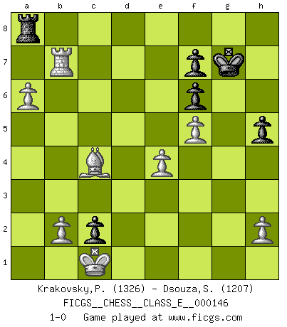 Last move : 1-0 2012 March 10 14:4:22 [Event "FICGS__CHESS__CLASS_E__000146"] [Site "FICGS"] [Date "2011.12.20"] [Round "1"] [White "Krakovsky,Peter"] [Black "Dsouza,Stanislaus"] [Result "1-0"] [WhiteElo "1326"] [BlackElo "1207"] 1.e4 e5 2.Nf3 d6 3.d4 exd4 4.Nxd4 Nc6 5.Nc3 Nxd4 6.Qxd4 Be6 7.Be2 Nf6 8.f3 Be7 9.Be3 O-O 10.O-O-O c5 11.Qd2 a6 12.Bf4 b5 13.Bxd6 Bxd6 14.Qxd6 Qxd6 15.Rxd6 Rfd8 16.Rhd1 Rxd6 17.Rxd6 h6 18.a4 b4 19.Nd5 Kh7 20.Nxf6+ gxf6 21.Rxa6 Rb8 22.a5 c4 23.Rb6 Ra8 24.a6 b3 25.g4 Kg6 26.f4 h5 27.f5+ Bxf5 28.gxf5+ Kg7 29.Bxc4 bxc2 30.Rb7 1-0 Philidor : Exchange variation Kingside Castling by player Black (move 9) Queenside Castling by player White (move 10) Player White won this chess game. Follow this game move after move (download)Not only will I predict his triumph over Botvinnik, but I'll go further and say that he'll probably be the greatest Chess player that ever lived. (John Collins) Jeder leidlich begabte Spieler, er braucht keineswegs hervorragend veranlagt zu sein, kann es zum Meister bringen. Aber das ist ja auch gar nicht nötig! Der richtige Standpunkt ist es, zu seinem Vergnügen zu spielen, und man glaube ja nicht, dass der Genuss proportional dem Können sei. (Siegbert Tarrasch) ¿Que sería del Ajedrez sin errores graciosos?. (Kurt Richter) Il s'avisa de me proposer d'apprendre les échecs qu'il jouait un peu... me voilà forcené des échecs. J'achète un échiquier, je m'enferme dans ma chambre, j'y passe des jours et des nuits à vouloir apprendre par cur toutes les parties. (Jean-Jacques Rousseau, Confessions) It's only after you lost everything, Tyler says, that you're free to do anything. (Chuck Palahniuk, Fight Club)