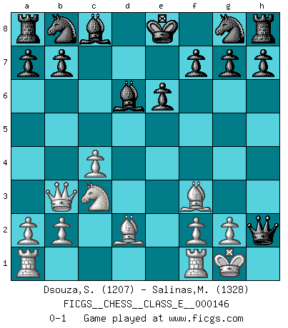 Last move : 0-1 2012 February 5 20:11:3 [Event "FICGS__CHESS__CLASS_E__000146"] [Site "FICGS"] [Date "2011.12.20"] [Round "1"] [White "Dsouza,Stanislaus"] [Black "Salinas,Marcelo"] [Result "0-1"] [WhiteElo "1207"] [BlackElo "1328"] 1.d4 e6 2.e4 d5 3.exd5 Qxd5 4.c4 Qa5 5.Bd2 Qf5 6.Nf3 c5 7.Be2 cxd4 8.Nxd4 Qe5 9.O-O Qxd4 10.Qb3 Qe5 11.Bf3 Bd6 12.Nc3 Qxh2+ 0-1 Queen's pawn Kingside Castling by player White (move 9) Player Black won this chess game. Follow this game move after move (download)Your body has to be in top condition. Your Chess deteriorates as your body does. You can't separate body from mind. (Bobby Fischer) Der Bart als Geschlechtszeichen mitten im Gesicht ist obszön. Daher gefällt er den Weibern. [Zugegeben, kein Schachzitat, aber unglaublich originell] (Arthur Schopenhauer) El Ajedrez es la vida. (Bobby Fischer) Même un GMI sait rarement calculer sur plus de cinq coups une attaque à sacrifices. (Rudolf Spielmann) Luck is when opportunity knocks and you answer. (Anonymous)