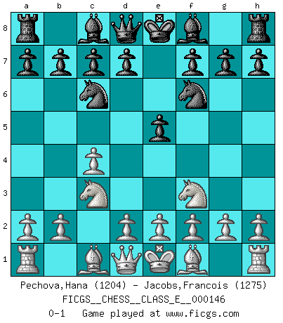 Last move : 0-1 2012 January 31 15:36:19 [Event "FICGS__CHESS__CLASS_E__000146"] [Site "FICGS"] [Date "2011.12.20"] [Round "1"] [White "Pechova,Hana"] [Black "Jacobs,Francois"] [Result "0-1"] [WhiteElo "1204"] [BlackElo "1275"] 1.c4 e5 2.Nc3 Nf6 3.Nf3 Nc6 0-1 English Opening Player Black won this chess game. Follow this game move after move (download)The game of Chess is not merely an idle amusement; several very valuable qualities of the mind are to be acquired and strengthened by it, so as to become habits ready on all occasions; for life is a kind of Chess. (Benjamin Franklin) Kasparov ist eine Art Monster mit hundert Augen, denen auch nicht das Geringste entgeht. (Tony Miles) Todos los Maestros de Ajedrez fueron un día unos principiantes. (Chernev) Un footballeur joue avec ses pieds, parfois avec sa tête. Un joueur d'échecs ne joue qu'avec sa tête. Et quand il ne joue plus, il meurt. (Jacob Murray) What doesn't kill us makes us stronger. (Friedrich Nietzsche)