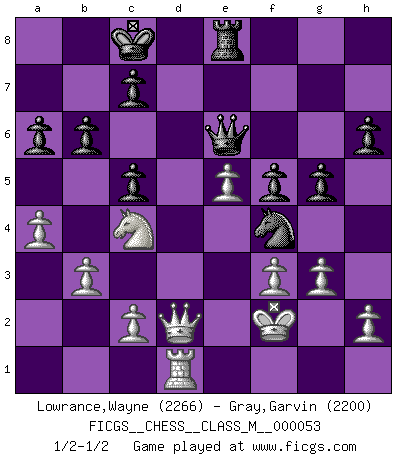 Last move : 1/2-1/2 2012 April 22 5:29:43 [Event "FICGS__CHESS__CLASS_M__000053"] [Site "FICGS"] [Date "2011.12.21"] [Round "1"] [White "Lowrance,Wayne"] [Black "Gray,Garvin"] [Result "1/2-1/2"] [WhiteElo "2266"] [BlackElo "2200"] 1.e4 e5 2.Nf3 Nc6 3.Bb5 a6 4.Bxc6 dxc6 5.O-O Bd6 6.d4 exd4 7.Qxd4 f6 8.Be3 Be6 9.Nbd2 Ne7 10.Qc3 Qd7 11.Rad1 Ng6 12.Nd4 O-O-O 13.f3 Rhe8 14.Nxe6 Qxe6 15.Nc4 Bf4 16.a4 b6 17.b3 c5 18.Bxf4 Nxf4 19.Kf2 Rxd1 20.Rxd1 f5 21.e5 g5 22.Qd2 h6 23.g3 1/2-1/2 Ruy Lopez : Exchange variation, 5.O-O Kingside Castling by player White (move 5) Queenside Castling by player Black (move 12) This chess game ended in a draw. Follow this game move after move (download)Fischer is under obligation to nobody. (Joseph Platz) Ein Kibitz ist einer, der deinem Gegner gute Ratschläge gibt. (Andrew Soltis) El Ajedrez era la lengua materna de Capablanca. (Reti) Shah mat. Le roi est mort. Cri de fierté d'un joueur venant de terrasser son adversaire, courtoisement, sans effusion de sang. You must do what you feel is right... of course. (Obi-Wan Kenobi in Star Wars ep.4)