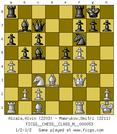 Last move : 1/2-1/2 2012 February 4 21:23:57 [Event "FICGS__CHESS__CLASS_M__000053"] [Site "FICGS"] [Date "2011.12.21"] [Round "1"] [White "Alcala,Alvin"] [Black "Mamrukov,Dmitri"] [Result "1/2-1/2"] [WhiteElo "2203"] [BlackElo "2211"] 1.e4 c5 2.Nf3 e6 3.d4 cxd4 4.Nxd4 a6 5.Nc3 Qc7 6.Bd3 Nc6 7.Nxc6 dxc6 8.O-O Nf6 9.f4 e5 10.Kh1 Bc5 11.Qf3 O-O 12.f5 b5 13.g4 Bb7 14.a4 1/2-1/2 Sicilian : Kan, 5.Nc3 Kingside Castling by player White (move 8) Kingside Castling by player Black (move 11) This chess game ended in a draw. Follow this game move after move (download)Suddenly it was obvious to me in my analysis I had missed what Fischer had found with the greatest of ease at the board. (Mikhail Botvinnik) Die größte Kunst beim Schach besteht darin dem Gegner nicht zu zeigen was er tun kann. (Garry Kasparov) No nos podemos resistir a la fascinación de un sacrificio ya que la pasión por los sacrificios es parte de la naturaleza de un jugador de Ajedrez. (Rudolf Spielman) Les pièces de l'échiquier étaient impitoyables. Elles le retenaient, elles l'absorbaient. Il y avait de l'horreur en cela, mais aussi une harmonie unique. Car, qu'y a-t-il dans le monde, à part les échecs ? (V. Nabokov) The good fighters of old first put themselves beyond the possibility of defeat, and then waited for an opportunity of defeating the enemy. (Sun Tzu)