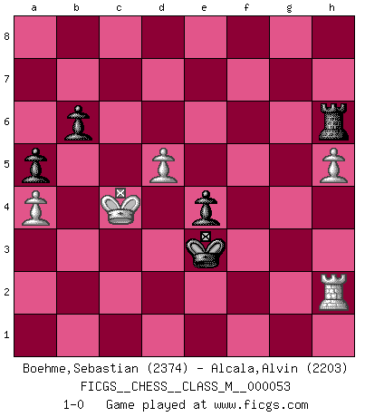 Last move : 1-0 2013 September 6 11:3:48 [Event "FICGS__CHESS__CLASS_M__000053"] [Site "FICGS"] [Date "2011.12.21"] [Round "1"] [White "Boehme,Sebastian"] [Black "Alcala,Alvin"] [Result "1-0"] [WhiteElo "2374"] [BlackElo "2203"] 1.e4 c5 2.Nf3 d6 3.d4 cxd4 4.Nxd4 Nf6 5.Nc3 a6 6.f3 e5 7.Nb3 Be6 8.Be3 h5 9.Qd2 Nbd7 10.Nd5 Nxd5 11.exd5 Bf5 12.Na5 Rb8 13.a4 Be7 14.Nc4 O-O 15.Be2 h4 16.a5 Bg6 17.Rg1 Rc8 18.g4 Nc5 19.g5 Rc7 20.b3 Bf5 21.O-O-O Re8 22.Qe1 Qd7 23.Nb6 Na4 24.Bd3 Nxb6 25.axb6 R7c8 26.Qxh4 Rc3 27.Qa4 Qxa4 28.bxa4 Bg6 29.Kb2 Rec8 30.Rd2 Bxd3 31.cxd3 f5 32.gxf6 Bxf6 33.Bg5 Kf7 34.h4 g6 35.Bxf6 Kxf6 36.Rg5 a5 37.Rdg2 Rxd3 38.Rxg6+ Kf5 39.Rxd6 Rxf3 40.Rd7 Rc4 41.Rf7+ Ke4 42.Rxf3 Kxf3 43.Rg7 Rb4+ 44.Kc3 Rxb6 45.h5 e4 46.Rf7+ Ke3 47.Rf1 Rd6 48.Kc4 Kd2 49.Rf2+ Ke3 50.Rh2 Rh6 51.Kc5 b6+ 52.Kc4 1-0 Sicilian : Najdorf Kingside Castling by player Black (move 14) Queenside Castling by player White (move 21) 10 pieces endgame at move 44 : White KRPPP , Black KRPPP WHITE : King + 1 Rook 3 Pawns BLACK : King + 1 Rook 3 Pawns Player White won this chess game. Follow this game move after move (download)Every Chess master was once a beginner. (Chernev) Kostenjuk hat keinen Sexappeal. (Loek van Wely) El juego del Ajedrez no es solamente una diversión quieta; algunas cualidades muy valuables de la mente se pueden adquirir y cultivar con el, como convertirlos en habitos disponibles para toda ocasión; ya que la vida es algo así como el Ajedrez. (Benjamin Franklin) Votre seul travail dans les ouvertures est d'obtenir un milieu de partie jouable. (Lajos Portish) There is a computer disease that anybody who works with computers knows about. It's a very serious disease and it interferes completely with the work. The trouble with computers is that you 'play' with them ! (Richard P. Feynman)