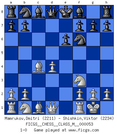 Last move : 1-0 2012 February 1 18:42:13 [Event "FICGS__CHESS__CLASS_M__000053"] [Site "FICGS"] [Date "2011.12.21"] [Round "1"] [White "Mamrukov,Dmitri"] [Black "Shishkin,Viktor"] [Result "1-0"] [WhiteElo "2211"] [BlackElo "2234"] 1.d4 d5 2.c4 dxc4 3.Nf3 Nf6 4.e3 e6 5.Bxc4 c5 6.O-O cxd4 7.exd4 1-0 This chess game has been lost on time (started : 2011.12.21 18:41:0) QGA : Classical, Steinitz variation Kingside Castling by player White (move 6) Player White won this chess game. Follow this game move after move (download)Best by test: 1. e4 (Bobby Fischer) Du musst nicht gut spielen, es reicht, wenn du besser spielst als dein Gegner. (Anonymous) Entre mas años cumplo, mas valoro los Peones. (Keres) Un journaliste : 'Vous préférez avoir une dame de plus sur l'échiquier ou au lit ?' Boris Spassky : 'Ca dépend de la position.' All the troubles of the world come from being unable to sit alone in a quiet room. (Blaise Pascal)