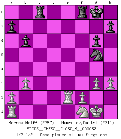 Last move : 1/2-1/2 2012 January 10 22:9:20 [Event "FICGS__CHESS__CLASS_M__000053"] [Site "FICGS"] [Date "2011.12.21"] [Round "1"] [White "Morrow,Wolff"] [Black "Mamrukov,Dmitri"] [Result "1/2-1/2"] [WhiteElo "2257"] [BlackElo "2211"] 1.d4 Nf6 2.c4 e6 3.Nf3 b6 4.g3 Ba6 5.b3 Bb4+ 6.Bd2 Be7 7.Bg2 c6 8.Bc3 d5 9.Nbd2 Nbd7 10.e4 O-O 11.e5 Ng4 12.O-O Rc8 13.Re1 Bb7 14.Nf1 c5 15.N3d2 cxd4 16.Bxd4 f5 17.h3 Nh6 18.cxd5 exd5 19.Nc4 Nc5 20.Bxc5 Bxc5 21.Nd6 Bxd6 22.Bxd5+ Bxd5 23.Qxd5+ Nf7 24.exd6 Qxd6 25.Qxf5 g6 26.Qe6 Qxe6 27.Rxe6 Ng5 28.Re2 1/2-1/2 Queen's Indian : Nimzovich variation (exaggerated Fianchetto) Kingside Castling by player Black (move 10) Kingside Castling by player White (move 12) This chess game ended in a draw. Follow this game move after move (download)Via the squares on the chessboard, the Indians explain the movement of time and the age, the higher influences which control the world and the ties which link Chess with the human soul. (Al-Masudi) Ein Großmeister muß tausende Partien in seinem Kopf speichern, denn diese sind für Ihn, was die Worte der Muttersprache für gewöhnliche Leute sind, oder Noten für Musiker... (Garry Kasparov) Debes de llevar a tu oponente hacia un profundo y obscuro bosque donde 2+2=5, y el camino que conduce a la salida es suficientemente ancho para solamente uno. (Mikhail Tal) Donnez-moi un Cavalier en 6e et je gagnerais toutes mes parties. (Steinitz) Waiting for chance ? Play in casinos. (FICGS proverb)