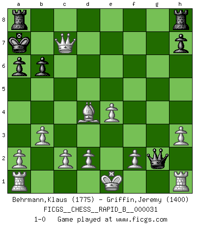 Last move : 1-0 2007 January 27 23:18:20 [Event "FICGS__CHESS__RAPID_B__000031"] [Site "FICGS"] [Date "2007.01.11"] [Round "1"] [White "Behrmann,Klaus"] [Black "Griffin,Jeremy"] [Result "1-0"] [WhiteElo "1775"] [BlackElo "1400"] 1.b3 d5 2.Bb2 c5 3.Nf3 Nc6 4.e3 f6 5.Bb5 Bg4 6.h3 Bxf3 7.Qxf3 e5 8.Nc3 Nge7 9.e4 d4 10.Nd5 a6 11.Qh5+ Kd7 12.Nxe7 Bxe7 13.Qg4+ Kc7 14.Bxc6 Kxc6 15.Qxg7 Qg8 16.Qxe7 Qxg2 17.Qxf6+ Kc7 18.Qxe5+ Kb6 19.Qd6+ Ka7 20.Qxc5+ Kb8 21.Qe5+ Ka7 22.Bxd4+ b6 23.Qc7+ 1-0 Nimzovich-Larsen attack : Classical variation Player White won this chess game. Follow this game move after move (download)When you absolutely don't know what to do anymore, it is time to panic. (John van der Wiel) Weshalb minderdergeübte Spieler mit g2-g4 beginnen? Die betreffenden sind unschlüssig, ob sie nun rechts (h4) oder links (f4) beginnen sollen, und in ihrer Ratlosigkeit entschliessen sie sich nach guter Bürgerart dazu, den goldenen Mittelweg zu wählen. (Aaron Nimzowitsch) El Ajedrez no es una pizca de inferior al violín, y tenemos un gran número de violinistas profesionales. (Mikhail Botvinnik) La solitude du joueur d'Echecs à l'approche du mat est semblable à celle du condamné. (Francis Szpiner) Whatever you do, don't be bored. This is absolutely the most exciting time we could have possibly hoped to be alive. And things are just starting. (From movie Waking life)