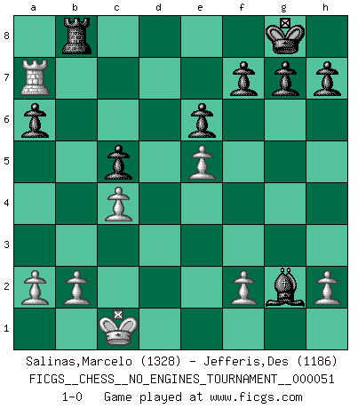 Last move : 1-0 2012 March 20 21:34:9 [Event "FICGS__CHESS__NO_ENGINES_TOURNAMENT__000051"] [Site "FICGS"] [Date "2011.12.23"] [Round "1"] [White "Salinas,Marcelo"] [Black "Jefferis,Des"] [Result "1-0"] [WhiteElo "1328"] [BlackElo "1186"] 1.d4 d5 2.Nc3 e6 3.e4 dxe4 4.Nxe4 Be7 5.Qf3 Nf6 6.Ne2 O-O 7.Qg3 Nxe4 8.Qd3 Nd6 9.Qg3 Bf6 10.Bf4 Na6 11.O-O-O Nf5 12.Qc3 c6 13.Be5 Bxe5 14.dxe5 Qb6 15.Nd4 Nxd4 16.Bxa6 bxa6 17.Rxd4 Bb7 18.Rhd1 Rad8 19.Qd3 Rxd4 20.Qxd4 Qxd4 21.Rxd4 Rb8 22.c4 c5 23.Rd7 Bxg2 24.Rxa7 1-0 Queen's pawn : Chigorin variation Kingside Castling by player Black (move 6) Queenside Castling by player White (move 11) Player White won this chess game. Follow this game move after move (download)The most powerful weapon in Chess is to have the next move. (David Bronstein) Das Zentrum ist der Balkan des Schachbretts - Kriegshandlungen können in jedem Moment ausbrechen. (Aaron Nimzowitsch) Debes de llevar a tu oponente hacia un profundo y obscuro bosque donde 2+2=5, y el camino que conduce a la salida es suficientemente ancho para solamente uno. (Mikhail Tal) La solitude du joueur d'Echecs à l'approche du mat est semblable à celle du condamné. (Francis Szpiner) I live to kill Traxler counterattack. (Ilmars Cirulis)