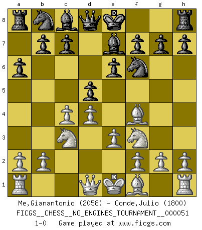 Last move : 1-0 2012 March 8 8:16:8 [Event "FICGS__CHESS__NO_ENGINES_TOURNAMENT__000051"] [Site "FICGS"] [Date "2011.12.23"] [Round "1"] [White "Me,Gianantonio"] [Black "Conde,Julio"] [Result "1-0"] [WhiteElo "2058"] [BlackElo "1800"] 1.d4 d5 2.Nf3 e6 3.c4 Nf6 4.Nc3 Be7 5.Bf4 a6 6.e3 1-0 This chess game has been lost on time (started : 2011.12.23 23:15:53) Queen's pawn game Player White won this chess game. Follow this game move after move (download)A good player is always lucky. (Jose Raul Capablanca) Ein Schachgenie ist jemand der verdammt gut Schach spielt. (Jonathan Levitt) Por tratar de evitar la pérdida de una pieza, muchas personas han perdido una partida de Ajedrez. (Savielly Tartakover) Le pion, dans sa simplicité, marche droit devant lui, mais lorsqu'il prend, il le fait obliquement? Ainsi l'homme, tant qu'il reste pauvre, marche dans la droiture et vit honnêtement, mais lorsqu'il recherche les honneurs, il flatte, se parjure et, par les voies obliques, cherche une position supérieure sur l'échiquier du monde. (Jean de Galles) I teach you to lie, cheat and steal, and as soon as my back's turned you wait in line ? (Gregory House, House M.D.)