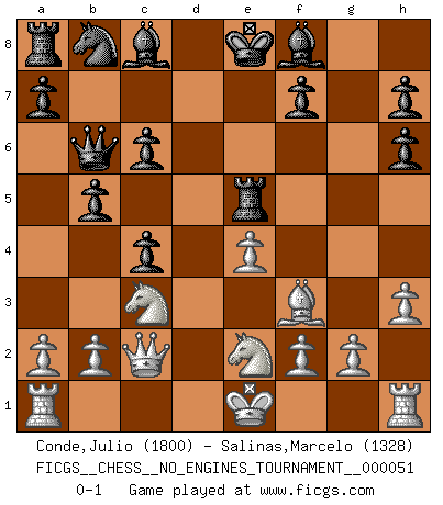 Last move : 0-1 2012 April 15 11:46:27 [Event "FICGS__CHESS__NO_ENGINES_TOURNAMENT__000051"] [Site "FICGS"] [Date "2011.12.23"] [Round "1"] [White "Conde,Julio"] [Black "Salinas,Marcelo"] [Result "0-1"] [WhiteElo "1800"] [BlackElo "1328"] 1.d4 Nf6 2.c4 d5 3.Nc3 dxc4 4.e4 e5 5.Qa4+ c6 6.dxe5 b5 7.Qc2 Ng4 8.Bf4 Qb6 9.h3 Nh6 10.Bxh6 gxh6 11.Be2 Rg8 12.Bf3 Rg5 13.Nge2 Rxe5 0-1 Queen's pawn game Player Black won this chess game. Follow this game move after move (download)I don't believe in psychology. I believe in good moves. (Bobby Fischer) Ein bischen Romantik kann weder im Schach noch in der Liebe schaden. Also versuche ich mich ab und zu daran zu erinnern. (Nigel Short) No es una movida, aún la mejor movida que tu debas buscar, sino un plan comprensible. (Eugene Znosko-Borovsky) Ce qui caractérise les parties de combat, c'est que si le défenseur a constamment de difficiles problèmes à résoudre, l'attaquant doit chercher sans relâche de nouvelles possibilités d'attaque. (Koblentz) There is no vagueness without wind. (Chinese proverb)