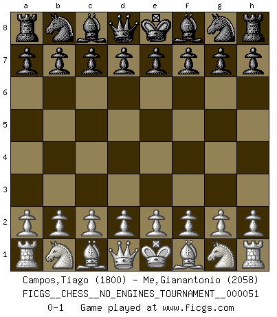 Last move : 0-1 2012 February 2 6:45:17 [Event "FICGS__CHESS__NO_ENGINES_TOURNAMENT__000051"] [Site "FICGS"] [Date "2011.12.23"] [Round "1"] [White "Campos,Tiago"] [Black "Me,Gianantonio"] [Result "0-1"] [WhiteElo "1800"] [BlackElo "2058"] 0-1 This chess game has been lost on time (started : 2011.12.23 23:15:53) Player Black won this chess game. Follow this game move after move (download)You have to have the fighting spirit. You have to force moves and take chances. (Bobby Fischer) Ein Isolani verdüstert die Stimmung auf dem ganzen Schachbrett. (Savielly Grigorievitsch Tartakower) Si tu oponente no puede hacer nada activo, entonces no apures la posición; En vez de eso, dejalo estar sentado ahí, sufriendo y rogandote por un empate. (Jeremy Silman) Botvinnik disait en comparant les échecs à la musique: Il existe une science dont le but est l'étude de l'acoustique et des sons. Mais il y a aussi un art qui se sert de l'océan des sons : c'est la musique. De toute évidence, il en est de même pour la pensée. La logique est l'étude des lois de la réflexion et les échecs reflètent, en tant qu'art, le côté logique de la réflexion, sous la forme d'images artistiques... Extrait de Fischer - Spassky, Reykjavik 1972 par Alexander & F. Wyndham (Ed. Solar), p 37. A good programmer is someone who always looks both ways before crossing a one-way street. (Doug Linder)