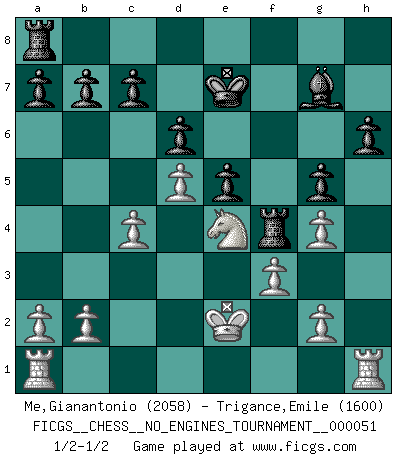 Last move : 1/2-1/2 2012 May 24 0:57:21 [Event "FICGS__CHESS__NO_ENGINES_TOURNAMENT__000051"] [Site "FICGS"] [Date "2011.12.23"] [Round "1"] [White "Me,Gianantonio"] [Black "Trigance,Emile"] [Result "1/2-1/2"] [WhiteElo "2058"] [BlackElo "1600"] 1.d4 Nf6 2.Nf3 g6 3.c4 Bg7 4.Nc3 d6 5.e4 O-O 6.Be2 e5 7.Be3 Ng4 8.Bg5 f6 9.Bh4 g5 10.Bg3 Nh6 11.d5 f5 12.exf5 Nxf5 13.Nd2 Nxg3 14.hxg3 Nd7 15.Bd3 Nf6 16.Nde4 Nxe4 17.Bxe4 Bf5 18.Qd3 Qf6 19.Bxf5 Qxf5 20.Qxf5 Rxf5 21.Ne4 h6 22.g4 Rf4 23.f3 Kf8 24.Ke2 Ke7 1/2-1/2 King's Indian : East Indian defense Kingside Castling by player Black (move 5) This chess game ended in a draw. Follow this game move after move (download)Dazzling combinations are for the many, shifting wood is for the few. (Georg Kieninger) Auf Remis zu spielen ist gewissermaßen ein Verbrechen gegen das Schachspiel. (Mikhail Nekhemyevich Tal) Aquel que ve no otra dirección en el juego que la de dar Jaque Mate a su oponente, nunca será un buen jugador de Ajedrez. (Euwe) Le plus grand jeu de l'esprit jamais inventé, plus vous l'apprenez, plus vous y prenez du plaisir. (Garry Kasparov) Rules and bones are meant to be broken. (Anonymous)