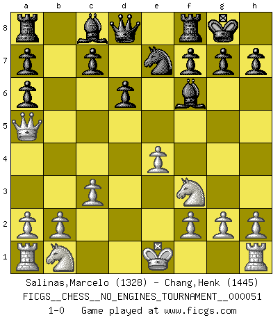 Last move : 1-0 2012 April 14 23:45:42 [Event "FICGS__CHESS__NO_ENGINES_TOURNAMENT__000051"] [Site "FICGS"] [Date "2011.12.23"] [Round "1"] [White "Salinas,Marcelo"] [Black "Chang,Henk"] [Result "1-0"] [WhiteElo "1328"] [BlackElo "1445"] 1.e4 e5 2.d4 exd4 3.Qxd4 Nc6 4.Qd5 Nf6 5.Bg5 Be7 6.Bxf6 Bxf6 7.c3 O-O 8.Nf3 d6 9.Ba6 Ne7 10.Qb5 bxa6 11.Qa5 1-0 Centre game Kingside Castling by player Black (move 7) Player White won this chess game. Follow this game move after move (download)Openings teach you openings. Endgames teach you chess ! (Stephan Gerzadowicz) Ich hatte Zahnschmerzen im ersten Spiel. In der zweiten Partie tat mir der Kopf weh. In der dritten war es eine Rheuma-Attacke und während der vierten fühlte ich mich nicht gut. Und in der fünften? Nun, man muss doch nicht jedes Spiel gewinnen, oder? (Savielly Grigorievitsch Tartakower) Me siento como si fuera una pieza en una partida de Ajedrez, cuando mi oponente me indica: esa pieza no puede ser movida. (Soren Kierkegaard) Fischer est le meilleur joueur du monde et Karpov n'est qu'un joueur de bistrot. (Garry Kasparov, agé de 16 ans) Ah, the Socrating method. The best way we have of teaching everything-apart from juggling chainsaws. (Gregory House, House M.D.)