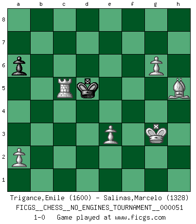 Last move : 1-0 2012 November 19 22:52:31 [Event "FICGS__CHESS__NO_ENGINES_TOURNAMENT__000051"] [Site "FICGS"] [Date "2011.12.23"] [Round "1"] [White "Trigance,Emile"] [Black "Salinas,Marcelo"] [Result "1-0"] [WhiteElo "1600"] [BlackElo "1328"] 1.b4 e6 2.Bb2 Bxb4 3.Bxg7 Be7 4.Bxh8 f6 5.Bg7 Kf7 6.e4 Kxg7 7.d4 Nh6 8.Bd3 Qe8 9.Nh3 e5 10.O-O d6 11.Kh1 Bg4 12.Be2 f5 13.exf5 Bxf5 14.Bd3 e4 15.Be2 d5 16.Nf4 Qf7 17.Bh5 Bg6 18.Nxg6 hxg6 19.Be2 Nd7 20.Nd2 Nf5 21.Bg4 Rh8 22.Rb1 Bd6 23.Bh3 b6 24.Qg4 Rh5 25.c4 e3 26.fxe3 Nf6 27.Qe2 Ne4 28.Nxe4 dxe4 29.Rf2 Rg5 30.g4 Bg3 31.Rxf5 gxf5 32.hxg3 Kf6 33.Rf1 Qh7 34.Kg2 Ke6 35.d5+ Kd6 36.Rxf5 Rg8 37.g5 Rh8 38.Qg4 Kc5 39.d6 Kxd6 40.Rd5+ Kc6 41.Qd7+ Qxd7 42.Bxd7+ Kb7 43.g6 c6 44.Rg5 Rg8 45.g7 Rd8 46.Be6 Kc7 47.g8Q Rxg8 48.Rxg8 Kd6 49.Bf7 Ke7 50.Bh5 Kf6 51.g4 c5 52.Kg3 Ke5 53.Re8+ Kf6 54.Rxe4 a6 55.Rf4+ Ke5 56.g5 b5 57.g6 bxc4 58.Rxc4 Kd5 59.Rxc5+ 1-0 This chess game has been lost on time (started : 2011.12.23 23:15:53) Polish (Sokolsky) opening Kingside Castling by player White (move 10) Promotion Queen by player White (move 47) 10 pieces endgame at move 57 : White KRBPPP , Black KPPP WHITE : King + 1 Rook 1 Bishop 3 Pawns BLACK : King + 3 Pawns 9 pieces endgame at move 58 : White KRBPPP , Black KPP WHITE : King + 1 Rook 1 Bishop 3 Pawns BLACK : King + 2 Pawns 8 pieces endgame at move 59 : White KRBPPP , Black KP WHITE : King + 1 Rook 1 Bishop 3 Pawns BLACK : King + 1 Pawn Player White won this chess game. Follow this game move after move (download)Chess mastery essentially consists of analyzing Chess positions accurately. (Mikhail Botvinnik) Wenn Spassky eine Figur opfert kannst du genauso gut aufgeben. Aber wenn Tal eine Figur opfert, spiel weiter. Er könnte noch eine weitere opfern, und dann ... wer weiß? (Miguel Najdorf) Aquel que toma al Peón de Caballo de la Reina, se pasará la noche a dormir en la calle. (Anónimo) L'attaque fait le spectacle, la défense gagne les matchs. (Dicton footballistique) A specialist learns more and more about less and less until he knows everything about nothing. (Nicholas Murray Butler)