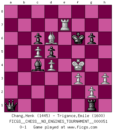 Last move : 0-1 2012 January 27 22:51:50 [Event "FICGS__CHESS__NO_ENGINES_TOURNAMENT__000051"] [Site "FICGS"] [Date "2011.12.23"] [Round "1"] [White "Chang,Henk"] [Black "Trigance,Emile"] [Result "0-1"] [WhiteElo "1445"] [BlackElo "1600"] 1.c4 e5 2.Nc3 Nf6 3.Nf3 Nc6 4.d4 exd4 5.Nxd4 Bb4 6.e3 O-O 7.Bd3 Nxd4 8.exd4 Re8+ 9.Be3 d5 10.O-O Bxc3 11.bxc3 Ng4 12.Bf4 c6 13.h3 Nf6 14.c5 Ne4 15.Qc2 f5 16.f3 Ng5 17.Bxf5 Qf6 18.Bxg5 Qxf5 19.Qxf5 Bxf5 20.Bf4 Re2 21.Rfe1 Rae8 22.Rxe2 Rxe2 23.Kf1 Bd3 24.Kg1 Bc4 25.a3 Rc2 26.Rb1 Rxc3 27.Rxb7 Rxa3 28.Rc7 Bb5 29.Rc8+ Kf7 30.Bb8 a5 31.Rc7+ Kg8 32.Ra7 a4 33.Be5 Ra1+ 34.Kf2 g6 35.Rg7+ Kf8 36.Rxh7 a3 37.Rh8+ Kf7 38.Ra8 a2 39.Kg3 Bc4 40.Ra7+ Ke6 41.Kf4 Rg1 42.Bd6 a1Q 43.Re7+ Kf6 0-1 English Opening Kingside Castling by player Black (move 6) Kingside Castling by player White (move 10) Promotion Queen by player Black (move 42) Player Black won this chess game. Follow this game move after move (download)Fischer prefers to enter Chess history alone. (Miguel Najdorf) Sicherlich können nur Meister einen Stil haben. Daß ein nicht-Meister auch nur ein einziges Mal in seinem Leben eine Partie folgerecht durchführte, habe ich niemals bemerkt. (Emanuel Lasker) Los problemas de Ajedrez exigen del compositor las mismas virtudes que caracterizan todo el arte de valor: originalidad, invención, concisión, armonía, complejidad e insinceridad explendida. (Vladimir Nabokov) Avant la finale, les dieux ont créé le milieu de partie. (Tarrasch) Now be brave and don't look back. Don't look back. (Shmi Skywalker in Star Wars ep.1)