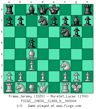 Last move : 1-0 2006 June 21 11:28:6 [Event "FICGS__CHESS__CLASS_D__000004"] [Site "FICGS"] [Date "2006.05.11"] [Round "1"] [White "Frame,Jeremy"] [Black "Muratet,Lucas"] [Result "1-0"] [WhiteElo "1520"] [BlackElo "1700"] 1.e4 c5 2.Nf3 d6 3.c3 Nf6 4.e5 dxe5 5.Nxe5 Nbd7 6.Nf3 g6 7.Bc4 Bg7 8.O-O 1-0 This chess game has been lost on time (started : 2006.05.11 8:43:21) Sicilian Kingside Castling by player White (move 8) Player White won this chess game. Follow this game move after move (download)Chess is played with the mind and not with the hands ! (Renaud and Kahn) Spielt Blackmar-Diemer-Gambit, und das Matt kommt von selbst! (Emil Joseph Diemer) No hay otro maestro que tenga una voluntad terrífica de ganar. Al tablero, el irradía peligro y aún los oponentes mas fuertes tienden a congelarse como liebres cuando olfatean a una pantera. Aún sus debilidades son peligrosas. Con las blancas, su juego de apertura es predecible - te es posible hacer planes en su contra - pero es tan fuerte que tus planes casi nunca funcionan. En el juego medio, su precisión e invención son fabulosas y en finales, tú simplemente no le puedes vencer. (Experto Alemán anónimo) Demandez au pauvre Cg1 ce qu'il en pense. Eduard Gufeld à propos de la variante Saemisch de l'Est-Indienne. If you ain't just a little scared when you enter a casino, you are either very rich or you haven't studied the games enough. (Pappy)