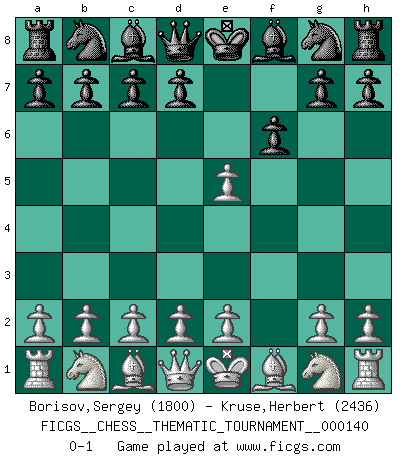 Last move : 0-1 2012 February 2 18:45:45 [Event "FICGS__CHESS__THEMATIC_TOURNAMENT__000140"] [Site "FICGS"] [Date "2011.12.24"] [Round "1"] [White "Borisov,Sergey"] [Black "Kruse,Herbert"] [Result "0-1"] [WhiteElo "1800"] [BlackElo "2436"] 1.f4 e5 2.fxe5 f6 0-1 This chess game has been lost on time (started : 2011.12.24 12:27:54) Bird : From gambit Player Black won this chess game. Follow this game move after move (download)One doesn't have to play well, it's enough to play better than your opponent. (Siegbert Tarrasch) Mein erstes Ziel war nicht, die Partie zu gewinnen, sondern eine Figur zu opfern. -- der junge (Wilhelm Steinitz) Fischer era un maestro de claridad y un Rey del posicionamiento astuto. Sus oponentes podían ver hacia donde se dirigía pero eran impotentes para detenerlo. (Bruce Pandolfini) Ne tendez aucun piège pour le plaisir ! Ne jouez rien dans l'espoir que l'adversaire réagisse de façon stupide ! Prenez toujours pour acquis que l'adversaire va trouver le meilleur coup ! Ne jouez jamais de coup dans l'espoir que l'adversaire ne voie pas la menace ! Chacun de vos coups doit améliorer la position d'une façon ou d'une autre. Some people are so afraid to die that they never begin to live. (Henry Van Dyke)