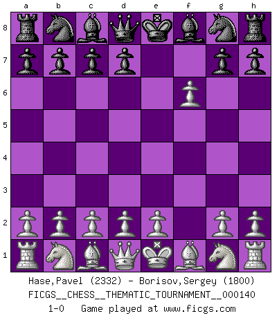 Last move : 1-0 2012 February 2 18:45:45 [Event "FICGS__CHESS__THEMATIC_TOURNAMENT__000140"] [Site "FICGS"] [Date "2011.12.24"] [Round "1"] [White "Hase,Pavel"] [Black "Borisov,Sergey"] [Result "1-0"] [WhiteElo "2332"] [BlackElo "1800"] 1.f4 e5 2.fxe5 f6 3.exf6 1-0 This chess game has been lost on time (started : 2011.12.24 12:27:54) Bird : From gambit Player White won this chess game. Follow this game move after move (download)Fischer is an American Chess tragedy on par with Morphy and Pillsbury. (Mig Greengard) Sie führen leise Selbstgespräche, schlürfen lautstark ihre Getränke, schmatzen hörbar beim Essen, blasen ihrem Gegenüber Rauch in die Augen, niesen ihm ins Gesicht, starren ihn unverwandt an, bis er sich unter ihren Blicken windet, rutschen ständig auf ihrem Stuhl hin und her, rülpsen und bohren in der Nase. (Anonymous) Tu no necesitas jugar muy bien, únicamente ayudar a tu oponenet a que juegue muy mal. (Genrikh Chepukaitis) C'est la seule position que je connaisse où les deux camps sont mals. Propos prêtés à V. Anand. 98% of all statistics are made up. (Author unknown)