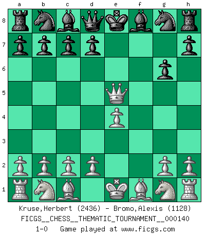 Last move : 1-0 2011 December 24 13:47:53 [Event "FICGS__CHESS__THEMATIC_TOURNAMENT__000140"] [Site "FICGS"] [Date "2011.12.24"] [Round "1"] [White "Kruse,Herbert"] [Black "Bromo,Alexis"] [Result "1-0"] [WhiteElo "2436"] [BlackElo "1128"] 1.f4 e5 2.fxe5 f6 3.e4 fxe5 4.Qh5+ g6 5.Qxe5+ 1-0 Bird : From gambit Player White won this chess game. Follow this game move after move (download)Morphy was probably the greatest genius of them all. (Bobby Fischer) Wenn ich gewinne bin ich ein Genie. Wenn nicht, dann bin ich keines. (Robert James Fischer) Todo lo que importa ante el tablero de Ajedrez son buenas jugadas. (Bobby Fischer) Je menace de comprendre la position. (Anonyme) The ultimate in disposing one's troops is to be without ascertainable shape. Then the most penetrating spies cannot pry in nor can the wise lay plans against you. (Sun Tzu)