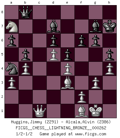 Last move : 1/2-1/2 2011 December 24 18:33:27 [Event "FICGS__CHESS__LIGHTNING_BRONZE__000262"] [Site "FICGS"] [Date "2011.12.24"] [Round "1"] [White "Huggins,Jimmy"] [Black "Alcala,Alvin"] [Result "1/2-1/2"] [WhiteElo "2291"] [BlackElo "2386"] 1.d4 Nf6 2.c4 g6 3.Nc3 Bg7 4.Nf3 O-O 5.g3 d6 6.Bg2 Nbd7 7.O-O e5 8.h3 c6 9.e4 Re8 10.Be3 a6 11.d5 cxd5 12.cxd5 b5 13.a3 Nb6 14.Nd2 Nfd7 15.Rc1 Nc5 16.Qe2 Bd7 17.b4 Nca4 18.Nxa4 Nxa4 19.Nb3 Qe7 20.Na5 Rec8 21.Rc2 Rxc2 22.Qxc2 Rc8 23.Nc6 Qf8 24.Rc1 f6 25.Qd2 h5 26.h4 Kh7 27.Na7 Rxc1+ 28.Qxc1 Qb8 29.Bf1 1/2-1/2 King's Indian defense, 3.Nc3 Kingside Castling by player Black (move 4) Kingside Castling by player White (move 7) This chess game ended in a draw. Follow this game move after move (download)If a ruler does not understand Chess, how can he rule over a kingdom ? (King Khusros II) Ein Remis kann durch Wiederholung von drei Zügen oder durch einen schlechte Zug erreicht werden. (Savielly Grigorievitsch Tartakower) Yo creo que el Ajedrez posee una magia que es también una ayuda en la edad avanzada. Una rodilla reumática es olvidada durante una partida de Ajedrez y otros eventos pueden parecer algo sin importancia comparada a una catástrofe en el tablero de Ajedrez. (Vlastimil Hort) Ce qui est bien, c'est d'avoir tout un tas de pièces en prise : l'adversaire ne peut en prendre qu'une à la fois. Cité par Thierry Audin. Don't anthropomorphize computers - they hate it. (Anonymous)