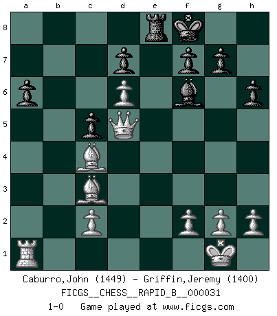 Last move : 1-0 2007 January 30 1:17:57 [Event "FICGS__CHESS__RAPID_B__000031"] [Site "FICGS"] [Date "2007.01.11"] [Round "1"] [White "Caburro,John"] [Black "Griffin,Jeremy"] [Result "1-0"] [WhiteElo "1449"] [BlackElo "1400"] 1.d4 c5 2.d5 b5 3.e4 Bb7 4.Bxb5 Nf6 5.Nc3 Qa5 6.Qe2 Na6 7.Nf3 Nb4 8.O-O e6 9.Bf4 a6 10.Bc4 Be7 11.a3 exd5 12.axb4 Qxb4 13.Nxd5 Bxd5 14.exd5 Qxb2 15.Rfb1 Qc3 16.Be5 Qxa1 17.Rxa1 O-O 18.d6 Bd8 19.Ng5 h6 20.Ne4 Nxe4 21.Qxe4 Re8 22.Qxa8 Kf8 23.Bc3 Bf6 24.Qd5 1-0 Old Benoni defense Kingside Castling by player White (move 8) Kingside Castling by player Black (move 17) Player White won this chess game. Follow this game move after move (download)The hallmark of the artist is simplicity. (Larry Evans) Ein Gewinn durch eine ungenaue Kombination, sei sie auch noch so vorzeigbar, erfüllt mich mit Schaudern. (Wilhelm Steinitz) Solo los afeminados hacen el Enroque. (Rob Sillars) On croit qu'il y a plus de mauvais joueurs que de bons joueurs, c'est faux : Il y a autant de joueurs qui gagnent que de joueurs qui perdent. (Philippe Geluck) When you stop learning you start dying. (Scott Adams)