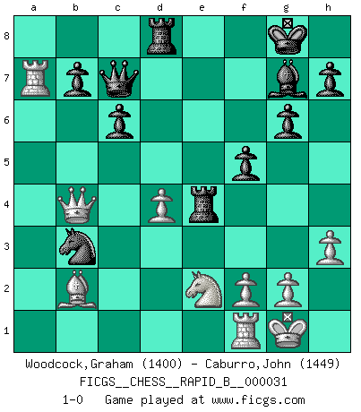 Last move : 1-0 2007 April 16 11:14:35 [Event "FICGS__CHESS__RAPID_B__000031"] [Site "FICGS"] [Date "2007.01.11"] [Round "1"] [White "Woodcock,Graham"] [Black "Caburro,John"] [Result "1-0"] [WhiteElo "1400"] [BlackElo "1449"] 1.c4 f5 2.e3 Nf6 3.Bd3 g6 4.b4 e5 5.c5 Bg7 6.Nc3 d6 7.Bb5+ c6 8.Ba4 dxc5 9.bxc5 O-O 10.Bb2 Nbd7 11.d4 exd4 12.exd4 Re8+ 13.Nge2 Qc7 14.h3 Nf8 15.O-O Be6 16.Bb3 Rad8 17.Qd2 Nd5 18.Nxd5 Bxd5 19.Nf4 Bxb3 20.axb3 Re4 21.Ne2 Ne6 22.Ra4 Nxc5 23.Rxa7 Nxb3 24.Qb4 1-0 This chess game has been lost on time (started : 2007.01.11 12:1:33) English : Anglo-Dutch defense Kingside Castling by player Black (move 9) Kingside Castling by player White (move 15) Player White won this chess game. Follow this game move after move (download)When I asked Fischer why he had not played a certain move in our game, he replied: 'Well, you laughed when I wrote it down !' (Mikhail Tal) Im Leben werden Partien nie so unstrittig gewonnen wie im Spiel (Emanuel Lasker) A través de las casillas del tablero, los Indios explican el movimiento del tiempo y la edad, las influencias mas altas que controlan el mundo y los lazos que vinculan al Ajedrez con el alma humana. (Al-Masudi) La menace est plus forte que l'exécution. (Aaron Nimzovitch) The real danger is not that computers will begin to think like men, but that men will begin to think like computers. (Sydney J. Harris)