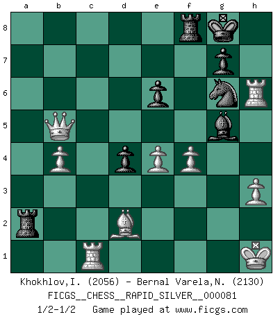 Last move : 1/2-1/2 2012 April 10 5:35:19 [Event "FICGS__CHESS__RAPID_SILVER__000081"] [Site "FICGS"] [Date "2011.12.26"] [Round "2"] [White "Khokhlov,Igor"] [Black "Bernal Varela,Nelson"] [Result "1/2-1/2"] [WhiteElo "2056"] [BlackElo "2130"] 1.c4 Nf6 2.Nf3 c5 3.Nc3 Nc6 4.g3 e5 5.Bg2 Be7 6.O-O d6 7.d3 O-O 8.a3 h6 9.Rb1 a5 10.Nd2 Bg4 11.Nde4 Nxe4 12.Bxe4 h5 13.Bd2 Qd7 14.Kh1 Bd8 15.Rg1 Rb8 16.f3 Be6 17.e3 Ne7 18.f4 b5 19.cxb5 d5 20.Bg2 Bg4 21.Qf1 exf4 22.gxf4 d4 23.exd4 cxd4 24.Ne4 Qxb5 25.b4 Qa6 26.Nc5 Qh6 27.Be4 axb4 28.axb4 Re8 29.h3 Bf5 30.Rc1 Rc8 31.Rg5 Bxe4+ 32.dxe4 Ng6 33.Rd5 Ra8 34.Qd3 Ra2 35.Qb5 Rf8 36.Ne6 fxe6 37.Rxh5 Bg5 38.Rxh6 1/2-1/2 English Opening Kingside Castling by player White (move 6) Kingside Castling by player Black (move 7) This chess game ended in a draw. Follow this game move after move (download)Without error there can be no brilliancy. (Emanuel Lasker) Zeige mir drei Eröffnungsvarianten und ich beweise dir, dass zwei davon inkorrekt sind. (Emanuel Lasker) Después de una mala apertura, hay una esperanza en el juego medio. Pero una vez que estas en finales, el momento de la verdad ha llegado. (Edmar Mednis) Si le désir cupide (et stupide) de gagner est une inépuisable source de souffrance, une combinaison brillante sur l'échiquier est une découverte : le coquelicot qui s'épanouit lorsque apparaît la Voie Lactée. (Arrabal) There is a very easy way to return from a casino with a small fortune : go there with a large one. (Jack Yelton)