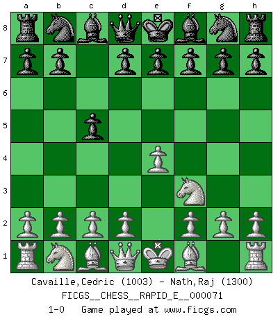 Last move : 1-0 2012 January 28 6:36:20 [Event "FICGS__CHESS__RAPID_E__000071"] [Site "FICGS"] [Date "2011.12.26"] [Round "1"] [White "Cavaille,Cedric"] [Black "Nath,Raj"] [Result "1-0"] [WhiteElo "1003"] [BlackElo "1300"] 1.e4 c5 2.Nf3 1-0 This chess game has been lost on time (started : 2011.12.26 9:36:36) Sicilian defense Player White won this chess game. Follow this game move after move (download)The essence of Chess is thinking about what Chess is. (David Bronstein) Dass jemand wie Surab Asmaiparaschwili, der selbst Elopunkte gekauft hat , Vize-Präsident der Fide werden konnte, sagt schon einges über den Zustand dieser Organisation aus. (Joel Lautier) Una buena memoria, concentración, imaginación y una fuerte voluntad, se requiere para llegar a ser un buen jugador. (Bobby Fischer) Aidez vos pièces, elles vous aideront. (Paul Morphy) Somewhere in the world there is an epigram for every dilemma. (Hendrik Willem van Loon)