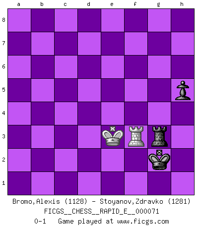 Last move : 0-1 2012 January 7 22:7:10 [Event "FICGS__CHESS__RAPID_E__000071"] [Site "FICGS"] [Date "2011.12.26"] [Round "1"] [White "Bromo,Alexis"] [Black "Stoyanov,Zdravko"] [Result "0-1"] [WhiteElo "1128"] [BlackElo "1281"] 1.d4 d5 2.c4 dxc4 3.Nc3 e6 4.e3 Nc6 5.Bxc4 Bb4 6.Bd2 a6 7.Nf3 h6 8.O-O Nf6 9.a3 Bxc3 10.Bxc3 O-O 11.h3 b5 12.Bb3 Ne4 13.Rc1 a5 14.Bd2 a4 15.Ba2 Qd7 16.Ne5 Nxe5 17.dxe5 Qxd2 18.Qxd2 Nxd2 19.Rfd1 Ne4 20.Rxc7 Ng5 21.f3 f6 22.exf6 gxf6 23.h4 Nf7 24.g4 Ne5 25.Kg2 Rb8 26.Kg3 f5 27.gxf5 Nc4 28.Bxc4 bxc4 29.Rxc4 exf5 30.Rxa4 Rxb2 31.Kf4 Be6 32.Rg1+ Kh7 33.Ra7+ Rf7 34.Rxf7+ Bxf7 35.Kxf5 Ra2 36.e4 Rxa3 37.f4 Ra5+ 38.Kf6 Bh5 39.e5 Ra7 40.e6 Bf3 41.e7 Ra6+ 42.Kf7 Bd5+ 43.Kf8 Rf6+ 44.Ke8 Bc6+ 45.Kd8 Rxf4 46.e8Q Bxe8 47.Kxe8 Rxh4 48.Kf7 Rf4+ 49.Ke6 h5 50.Ke5 Rf3 51.Ke4 Rf7 52.Rg5 Kh6 53.Rf5 Rg7 54.Rf6+ Kg5 55.Rf5+ Kg4 56.Rf4+ Kg3 57.Rf3+ Kg2 58.Ke3 Rg3 0-1 Queen's gambit accepted Kingside Castling by player White (move 8) Kingside Castling by player Black (move 10) 10 pieces endgame at move 35 : White KRPPPP , Black KRBP WHITE : King + 1 Rook 4 Pawns BLACK : King + 1 Rook 1 Bishop 1 Pawn 9 pieces endgame at move 36 : White KRPPP , Black KRBP WHITE : King + 1 Rook 3 Pawns BLACK : King + 1 Rook 1 Bishop 1 Pawn 8 pieces endgame at move 45 : White KRPP , Black KRBP WHITE : King + 1 Rook 2 Pawns BLACK : King + 1 Rook 1 Bishop 1 Pawn Promotion Queen by player White (move 46) 7 pieces endgame at move 46 : White KRP , Black KRBP WHITE : King + 1 Rook 1 Pawn BLACK : King + 1 Rook 1 Bishop 1 Pawn 6 pieces endgame at move 47 : White KRP , Black KRP WHITE : King + 1 Rook 1 Pawn BLACK : King + 1 Rook 1 Pawn 5 pieces endgame at move 47 : White KR , Black KRP WHITE : King + 1 Rook BLACK : King + 1 Rook 1 Pawn Player Black won this chess game. Follow this game move after move (download)Many have become Chess Masters, no one has become the Master of Chess. (Siegbert Tarrasch) Stelle das Brett so, daß die Sonne in die Augen deines Gegners scheint. (Ruy López) La batalla por la última verdad nunca sera ganada. Y es por eso que el Ajedrez es tan fascinante. (Hans Kmoch) Les écrivains ont utilisé les échecs pour analyser les côtés extrêmes de la nature humaine. Dans ce cadre, les échecs offrent un champ d'expérimentation idéal. Mais on pourrait faire la même chose avec la peinture. Et là, en vous référant à Van Gogh, vous ne tirerez pas de conclusion définitive sur les peintres. (Gary Kasparov) Winning isn't everything... but losing is nothing. (Mednis)