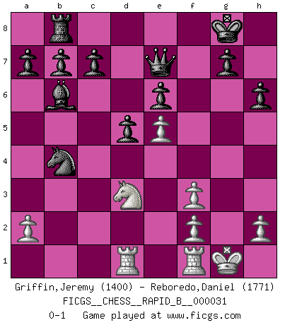 Last move : 0-1 2007 February 6 3:51:34 [Event "FICGS__CHESS__RAPID_B__000031"] [Site "FICGS"] [Date "2007.01.11"] [Round "1"] [White "Griffin,Jeremy"] [Black "Reboredo,Daniel"] [Result "0-1"] [WhiteElo "1400"] [BlackElo "1771"] 1.e4 e5 2.d4 exd4 3.c3 dxc3 4.Bc4 cxb2 5.Bxb2 d6 6.Nf3 Nc6 7.e5 Be6 8.Bxe6 fxe6 9.Qb3 Qd7 10.O-O d5 11.Bc3 Rb8 12.Nbd2 Bc5 13.Rad1 Nge7 14.Ne4 Bb6 15.Nfg5 h6 16.Nf3 O-O 17.Bb4 Nxb4 18.Qxb4 Rxf3 19.gxf3 Nc6 20.Nc5 Qe7 21.Nd3 Nxb4 0-1 Danish gambit Kingside Castling by player White (move 10) Kingside Castling by player Black (move 16) Player Black won this chess game. Follow this game move after move (download)Combinations have always been the most intriguing aspect of Chess. The masters look for them, the public applauds them, the critics praise them. It is because combinations are possible that Chess is more than a lifeless mathematical exercise. They are the poetry of the game; they are to Chess what melody is to music. They represent the triumph of mind over matter. (Reuben Fine) Gegen einen Schachcomputer zu verlieren ist wie Löcher in den Strümpfen zuhaben. Es ist nicht peinlich, solange man der einzige ist der es weiß. (Anonymous) Un juego de Ajedrez es un dialogo, una conversación entre un jugador y su oponente. Cada movimiento del oponente puede contener amenazas o tropiezos, pero un jugador no se puede defender de las amenazas o tomar ventaja de los tropiezos si es que no se pregunta a sí mismo: ¿Que es lo que mi oponente va a hacer después de cada movida?. (Bruce A. Moon) Plusieurs personnes se sont demandées comment Tal faisait pour gagner... En fait, c'est très simple ! Il met ses pièces au centre de l'échiquier et les sacrifie quelque part ! (David Bronstein) The existence of forgetting has never been proved: We only know that some things don't come to mind when we want them. (Friedrich Nietzsche)
