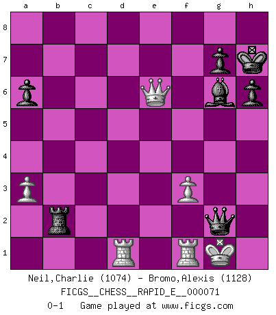 Last move : 0-1 2012 January 8 18:2:37 [Event "FICGS__CHESS__RAPID_E__000071"] [Site "FICGS"] [Date "2011.12.26"] [Round "1"] [White "Neil,Charlie"] [Black "Bromo,Alexis"] [Result "0-1"] [WhiteElo "1074"] [BlackElo "1128"] 1.d4 d5 2.c4 e6 3.Nf3 Nf6 4.Bg5 Be7 5.e3 Nc6 6.Nc3 a6 7.cxd5 exd5 8.Bd3 Bg4 9.O-O h6 10.Bf4 Bd6 11.Bxd6 Qxd6 12.Rc1 O-O 13.h3 Bxh3 14.Qc2 Ne7 15.Ne5 Be6 16.a3 Ng4 17.Nxg4 Bxg4 18.f3 Bh5 19.e4 dxe4 20.Bxe4 c6 21.Rcd1 f5 22.Bd3 Qxd4+ 23.Kh1 Qh4+ 24.Kg1 Nd5 25.Qb3 Kh8 26.Nxd5 cxd5 27.Qxd5 Rad8 28.Qxb7 Rb8 29.Qc6 Rxb2 30.Bc2 Rf6 31.Qc8+ Kh7 32.Bxf5+ Rxf5 33.Qxf5+ Bg6 34.Qh3 Qg5 35.Qe6 Qxg2+ 0-1 QGD Kingside Castling by player White (move 9) Kingside Castling by player Black (move 12) Player Black won this chess game. Follow this game move after move (download)Chess is a forcing house where the fruits of character can ripen more fully than in life. (Edward Morgan Foster) Im Fernschach kannst du während dem Spiel rauchen. (John Christen Knudsen) El Ajedrez no es como la vida... ¡tiene reglas!. (Mark Pasternak) Assurément je connaissais par expérience le mystérieux attrait de ce jeu royal, le seul entre tous les jeux inventés par les hommes qui échappe souverainement à la tyrannie du hasard, le seul où l'on ne doive sa victoire qu'à son intelligence ou plutôt à une certaine forme d'intelligence. Mais n'est-ce pas déjà le limiter injurieusement que d'appeler les échecs un jeu ? N'est-ce pas une science, un art ou quelque chose qui, comme le cercueil de Mahomet entre ciel et terre, est suspendu entre l'un et l'autre, et qui réunit un nombre incroyable de contraires ? [...] C'est une pensée qui ne mène à rien, une mathématique qui n'établit rien, un art qui ne laisse pas d'uvre, une architecture sans matière; et il l'a prouvé néanmoins qu'il était plus durable, à sa manière, que les livres ou que tout autre monument, ce jeu unique qui appartient à tous les peuples et à tous les temps, et dont personne ne sait quel dieu en fit don à la terre pour tuer l'ennui, pour aiguiser l'esprit et stimuler l'âme. Où commence-t-il, où finit-il ? (Stefan Zweig) Good luck. You're gonna need it. (Han Solo in Star Wars ep.6)