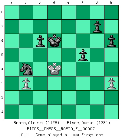 Last move : 0-1 2012 January 5 21:0:40 [Event "FICGS__CHESS__RAPID_E__000071"] [Site "FICGS"] [Date "2011.12.26"] [Round "1"] [White "Bromo,Alexis"] [Black "Pipac,Darko"] [Result "0-1"] [WhiteElo "1128"] [BlackElo "1281"] 1.d4 d5 2.c4 c6 3.c5 Nd7 4.Nf3 b6 5.Nc3 bxc5 6.dxc5 Nxc5 7.e3 Bg4 8.Be2 Nf6 9.h3 Bxf3 10.Bxf3 e5 11.b4 Nce4 12.Bxe4 dxe4 13.Qxd8+ Rxd8 14.Ba3 a5 15.Rb1 Rd3 16.Rb3 Nd5 17.Nxe4 Rxb3 18.axb3 Bxb4+ 19.Bxb4 axb4 20.Kd2 Ke7 21.Rc1 Rc8 22.g3 h6 23.f4 exf4 24.exf4 f5 25.Nc5 Re8 26.Kd3 Kd6 27.Na6 Re3+ 28.Kc4 Rxg3 29.Rd1 Rf3 30.Nxb4 Rxf4+ 31.Rd4 Rxd4+ 32.Kxd4 Nxb4 0-1 QGD Slav defense 10 pieces endgame at move 32 : White KNPP , Black KNPPPP WHITE : King + 1 Knight 2 Pawns BLACK : King + 1 Knight 4 Pawns 9 pieces endgame at move 32 : White KPP , Black KNPPPP WHITE : King + 2 Pawns BLACK : King + 1 Knight 4 Pawns Player Black won this chess game. Follow this game move after move (download)Pawns: they are the soul of this game, they alone form the attack and defense. (Philidor) Glücklicherweise sind Großmeister Ruben Fines reine Schachbücher weniger phallozentrisch [als seine Schachpsychologie] und deswegen auch weniger lächerlich. (Nigel Short) Yo nunca en mi vida he jugado la Defensa Francesa, que viene siendo la más aburrida de todas las Aperturas. (Wilhelm Steinitz) Le profane ne songe pas à la somme de jouissance dont il se prive, qui méconnaît ce jeu aux ressources aussi variées que passionnantes. (Jean-Marie Jeanton-Lamarche) No man has ever achieved immortality in his own life time. (Unknown)