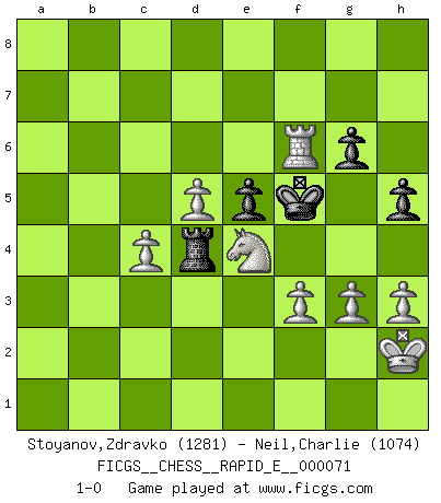 Last move : 1-0 2012 January 24 8:14:8 [Event "FICGS__CHESS__RAPID_E__000071"] [Site "FICGS"] [Date "2011.12.26"] [Round "1"] [White "Stoyanov,Zdravko"] [Black "Neil,Charlie"] [Result "1-0"] [WhiteElo "1281"] [BlackElo "1074"] 1.e4 e5 2.Nf3 Nc6 3.a3 Bc5 4.Bb5 d6 5.Bxc6+ bxc6 6.h3 Nf6 7.d3 Be6 8.O-O O-O 9.Bg5 h6 10.Bh4 Rb8 11.b3 Qd7 12.Kh2 Ne8 13.b4 Bb6 14.c3 c5 15.Nbd2 c6 16.bxc5 Bxc5 17.c4 Nc7 18.Qa4 a6 19.Nb3 Ba7 20.Na5 Ne8 21.Qxc6 Bc5 22.Qxa6 Nc7 23.Qc6 Qxc6 24.Nxc6 Ra8 25.Ne7+ Kh7 26.a4 Ra6 27.Nd5 Bxd5 28.exd5 Rfa8 29.Rfb1 f6 30.Rb7 Ne8 31.Nd2 Rxa4 32.Rxa4 Rxa4 33.f3 Ra2 34.Ne4 Be3 35.Bg3 Kg6 36.Re7 Ra8 37.Be1 Bf4+ 38.Bg3 Bxg3+ 39.Kxg3 Ra3 40.Rxe8 Rxd3 41.Nxd6 Rd4 42.Kh2 Kg5 43.Re7 g6 44.Nf7+ Kh5 45.Nd6 Kh4 46.g3+ Kg5 47.Ne4+ Kf5 48.Re6 h5 49.Rxf6+ 1-0 King's pawn game Kingside Castling by player White (move 8) Kingside Castling by player Black (move 8) Player White won this chess game. Follow this game move after move (download)Becoming successful at Chess allows you to discover your own personality. That's what I want for the kids I teach. (Saudin Robovic) Rubinstein ist ein Turmendspiel, welches die Götter vor tausenden von Jahren begannen. (Savielly Grigorievitsch Tartakower) Cuando veas una buena jugada, trata de encontrar otra mejor. (Emanuel Lasker) Ce qui est bien, c'est d'avoir tout un tas de pièces en prise : l'adversaire ne peut en prendre qu'une à la fois. Cité par Thierry Audin. Those parts of the system that you can hit with a hammer (not advised) are called hardware; those program instructions that you can only curse at are called software. (Anonymous)
