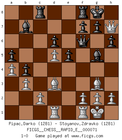 Last move : 1-0 2012 January 5 20:55:18 [Event "FICGS__CHESS__RAPID_E__000071"] [Site "FICGS"] [Date "2011.12.26"] [Round "1"] [White "Pipac,Darko"] [Black "Stoyanov,Zdravko"] [Result "1-0"] [WhiteElo "1281"] [BlackElo "1281"] 1.e4 c5 2.Nf3 a6 3.b3 Nc6 4.d4 cxd4 5.Nxd4 Nxd4 6.Qxd4 e6 7.Nc3 Nf6 8.Bg5 h6 9.Bh4 Be7 10.Bc4 b5 11.Be2 Bb7 12.O-O O-O 13.Rad1 d6 14.Bg3 Rc8 15.a4 e5 16.Qd3 b4 17.Nd5 Nxd5 18.exd5 Bg5 19.Qe4 a5 20.Bd3 Qf6 21.Qh7+ 1-0 Sicilian : O'Kelly variation Kingside Castling by player White (move 12) Kingside Castling by player Black (move 12) Player White won this chess game. Follow this game move after move (download)Chess is a matter of delicate judgment, knowing when to punch and how to duck. (Bobby Fischer) Den Ruhm habe ich schon, jetzt brauche ich noch das Geld. (Wilhelm Steinitz) Solo existe una cosa que Fischer hace en el Ajedrez sin placer: ¡perder!. (Boris Spassky) Les échecs sont plus proches de l'art de l'assassinat que de l'art de la guerre. (Arturo Perez-Reverte) Knowledge will give you power, but character respect. (Bruce Lee)