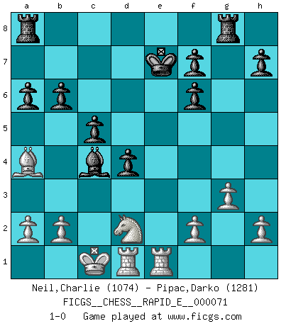 Last move : 1-0 2012 January 3 22:2:56 [Event "FICGS__CHESS__RAPID_E__000071"] [Site "FICGS"] [Date "2011.12.26"] [Round "1"] [White "Neil,Charlie"] [Black "Pipac,Darko"] [Result "1-0"] [WhiteElo "1074"] [BlackElo "1281"] 1.e4 e5 2.Nf3 Nc6 3.d4 exd4 4.Nxd4 Nxd4 5.Qxd4 Nf6 6.Nc3 c6 7.Bg5 d5 8.e5 c5 9.Qh4 Be7 10.exf6 Bxf6 11.Bxf6 Qxf6 12.Qxf6 gxf6 13.O-O-O d4 14.Ne4 b6 15.Bb5+ Ke7 16.Rhe1 Be6 17.g3 Rhg8 18.c4 a6 19.Ba4 Bxc4 20.Nd2 1-0 Scotch game Queenside Castling by player White (move 13) Player White won this chess game. Follow this game move after move (download)Openings teach you openings. Endgames teach you chess ! (Stephan Gerzadowicz) Der zweitbeste Zug ist oft der einzig richtige. (Savielly Grigorievitsch Tartakower) Yo no creo en la psicología. Yo creo en las buenas movidas. (Bobby Fischer) Shah mat. Le roi est mort. Cri de fierté d'un joueur venant de terrasser son adversaire, courtoisement, sans effusion de sang. Train yourself to let go of everything you fear to lose. (Master Yoda in Star Wars ep.3)