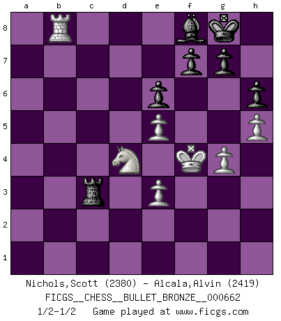 Last move : 1/2-1/2 2011 December 26 17:16:47 [Event "FICGS__CHESS__BULLET_BRONZE__000662"] [Site "FICGS"] [Date "2011.12.26"] [Round "1"] [White "Nichols,Scott"] [Black "Alcala,Alvin"] [Result "1/2-1/2"] [WhiteElo "2380"] [BlackElo "2419"] 1.d4 Nf6 2.c4 c6 3.Nf3 d5 4.Nc3 e6 5.e3 Nbd7 6.Qc2 Bd6 7.g4 h6 8.Bd2 dxc4 9.Bxc4 b5 10.Be2 Bb7 11.e4 b4 12.Na4 Be7 13.e5 Nd5 14.O-O Qc7 15.Rfc1 a5 16.a3 Ba6 17.Bxa6 Rxa6 18.Qc4 Qb7 19.Nc5 Nxc5 20.dxc5 Ra7 21.axb4 axb4 22.Rxa7 Qxa7 23.Bxb4 O-O 24.Be1 Ra8 25.h3 Qb7 26.b4 Ra3 27.Kg2 Qa8 28.Bd2 Qa4 29.Re1 Ra2 30.Rb1 Qa8 31.Qd3 Qa4 32.h4 Ra3 33.Qc4 Ra2 34.Kg3 Qa3 35.Rb3 Qa4 36.Qd3 Kh8 37.b5 cxb5 38.Rxb5 Bf8 39.Rb3 Kg8 40.Be3 Nxe3 41.fxe3 Qa8 42.Qb1 Ra1 43.Rb8 Rxb1 44.Rxa8 Rc1 45.h5 Rxc5 46.Nd4 Rc1 47.Kf4 Rc4 48.Rb8 Rc3 1/2-1/2 Queen's pawn game Kingside Castling by player White (move 14) Kingside Castling by player Black (move 23) This chess game ended in a draw. Follow this game move after move (download)Fischer prefers to enter Chess history alone. (Miguel Najdorf) Ich rechne überhaupt nicht voraus. Ich gewinne auch so. (Robert James Fischer) Muchos jugadores de Ajedrez se sorprendían cuando después de la partida, Fischer explicaba con calma: 'Yo ya había analizado esta posibilidad' en una posición en la cual yo creía que no era posible de prever desde la apertura. (Mikhail Tal) Roi des jeux et jeu des rois, les échecs portent en eux un sentiment d'infini. Ils donnent à celui qui s'est efforcé d'en approfondir les arcanes l'impression de n'être pas à la mesure de l'homme; en fait, ils constituent un résumé de l'univers, un microcosme, et figurent cette grande échelle qui, dans les plans de la lumière descend jusqu'à la matière, qui des abîmes insondables remonte jusqu'en l'infini de Dieu. (Pyrame) It is a good thing for an uneducated man to read books of quotations. (Winston Churchill)