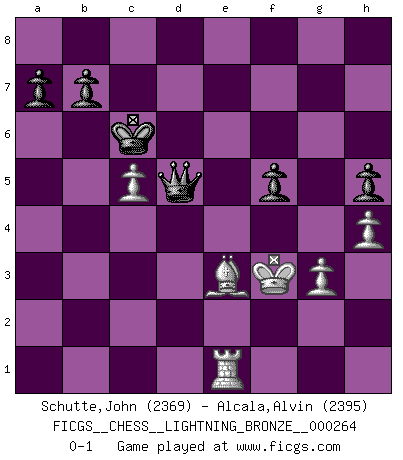 Last move : 0-1 2011 December 27 18:34:15 [Event "FICGS__CHESS__LIGHTNING_BRONZE__000264"] [Site "FICGS"] [Date "2011.12.27"] [Round "1"] [White "Schutte,John"] [Black "Alcala,Alvin"] [Result "0-1"] [WhiteElo "2369"] [BlackElo "2395"] 1.f4 d5 2.Nf3 g6 3.e4 dxe4 4.Ng5 Nf6 5.Bc4 Bg4 6.Bxf7+ Kd7 7.Qxg4+ Nxg4 8.Be6+ Kc6 9.Bxg4 Bg7 10.Nc3 e5 11.O-O h5 12.Bh3 Na6 13.Ne6 Qd7 14.Rb1 Nb4 15.Re1 Rhe8 16.Rxe4 Rxe6 17.Rxb4 exf4 18.Rc4+ Kb6 19.d3 Bd4+ 20.Kf1 c5 21.Ne4 f3 22.b4 Rf8 23.bxc5+ Kc6 24.Bd2 Rf5 25.g3 Qd5 26.Ra4 Rxe4 27.dxe4 Qxe4 28.Re1 Qd5 29.Bxf5 gxf5 30.Rxd4 Qxd4 31.Be3 Qc4+ 32.Kf2 Qxc2+ 33.Kxf3 Qxa2 34.h4 Qd5+ 0-1 Bird's Opening Kingside Castling by player White (move 11) Player Black won this chess game. Follow this game move after move (download)All Chess players should have a hobby. (Savielly Tartakower) Wenn Du einsam bist, wenn Du Dich in der Welt wie ein Fremder fühlst, spiele Schach. Das wird Deinen Geist erheben und Dein Ratgeber im Kampf sein. (Aristoteles) El Ajedrez es tan interesante por sí solo, que no es necesario un interés monetario para persuadir a una persona a que lo practique; por lo tanto, nunca se juega por dinero. (Benjamin Franklin) On peut tirer plus d'utilité d'une partie perdue que de 100 parties gagnées. (Capablanca) Man is still the most extraordinary computer of all. (John F. Kennedy)
