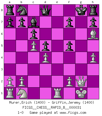 Last move : 1-0 2007 February 11 9:6:30 [Event "FICGS__CHESS__RAPID_B__000031"] [Site "FICGS"] [Date "2007.01.11"] [Round "1"] [White "Murer,Erich"] [Black "Griffin,Jeremy"] [Result "1-0"] [WhiteElo "1400"] [BlackElo "1400"] 1.e4 e5 2.Nf3 Nf6 3.Nxe5 d6 4.Nf3 Nxe4 5.d4 d5 6.Bd3 Bg4 7.O-O Bd6 8.h3 Bh5 9.c4 c6 10.c5 Bc7 11.Qb3 Bxf3 12.gxf3 Ng5 13.Re1+ Kf8 14.Bf5 g6 15.h4 Nxf3+ 16.Qxf3 gxf5 17.Bh6+ Kg8 18.Qg2+ 1-0 Petrov : Classical attack Kingside Castling by player White (move 7) Player White won this chess game. Follow this game move after move (download)Help your pieces so they can help you. (Paul Morphy) Schach ist das Spiel, das die Verrückten gesund hält. (Albert Einstein) El Ajedrez es un juego de pelea el cual es puramente intelectual e incluye la suerte. (Richard Reti) Il n'y a pas eu de défaite parce que je ne crois pas que cet ordinateur ait jamais existé. IBM a triché en refusant d'imprimer les modes de recherche de la machine. C'est évident, pendant le match, des coups décisifs ont été joués par des êtres humains. Aujourd'hui, les meilleurs spécialistes en informatique ne peuvent toujours pas expliquer comment Deep-Blue a pu jouer contre la logique des ordinateurs. IBM a gagné une guerre de communication, mais ils sont incapables de prouver que l'ordinateur a gagné tout seul. (Garry Kasparov) How many people work in NATO Headquarters ? - About half of them. (Dirk Stikker, NATO general secretary)